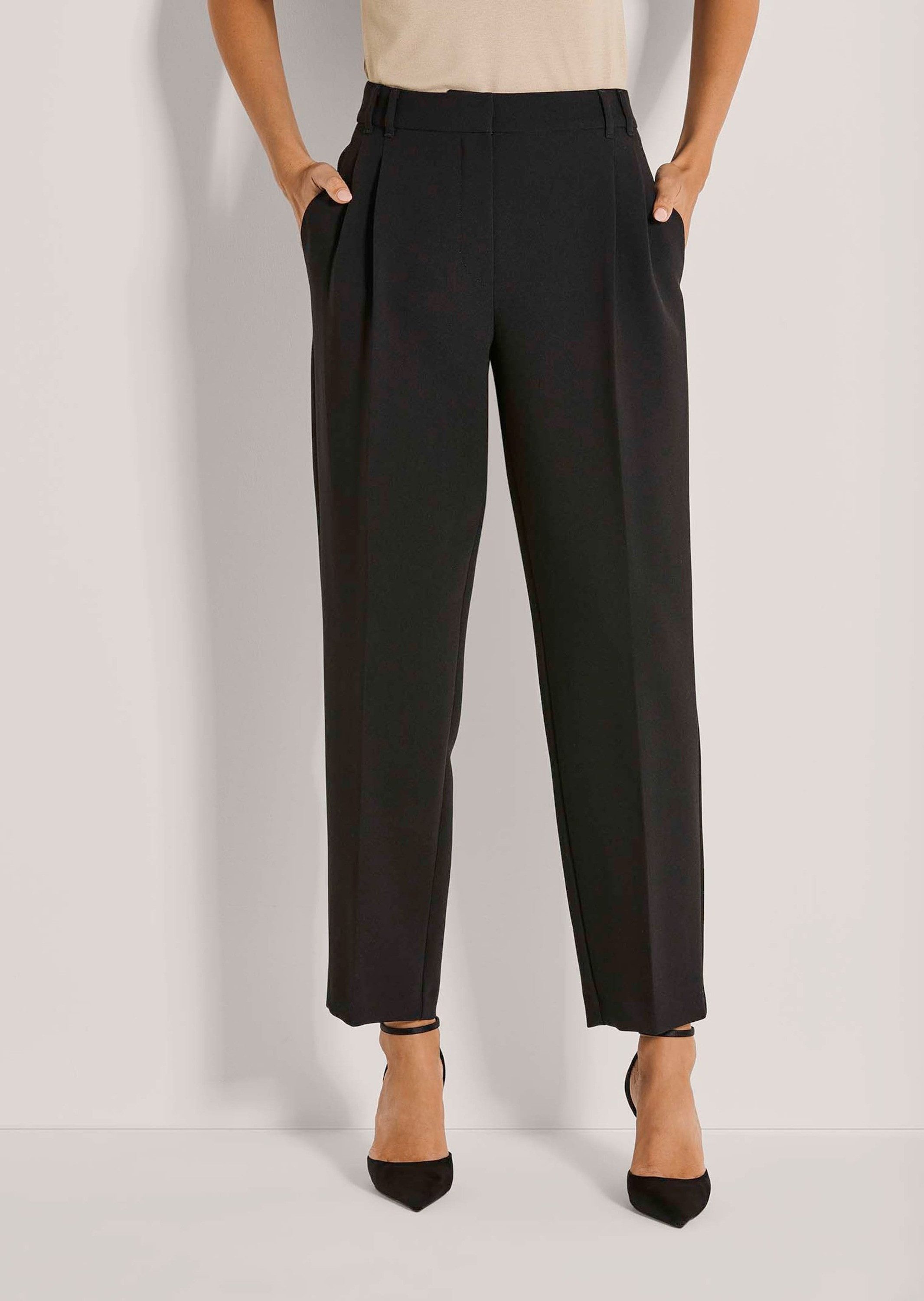 Eine klassisch elegante Hosen-Варианты, die mit hohem Tragekomfort begeistert. Die schmal zulaufende, konische Beinform sorgt für eine schmeichelnde Silhouette, während beidseitige Bügelfalten die seriöse Attitüde des Designs unterstreichen. Dank kunstvoll gearbeiteter Bundfalten erhält die Hose etwas mehr Hüftweite. Sie sorgt für eine optimale Passform und ein Plus an Bewegungsfreiheit. Der breite Formbund mit Gürtelschlaufen ist bequem im Sitz und wird per Haken- und Knopf fixiert. Schräg eingearbeitete Taschen bieten praktischen Stauraum und fügen sich harmonisch in das elegante Gesamtbild ein. Die rückseitige Zierleiste täuscht geschickt eine Gesäßtasche an und rundet den Look ab. Der hohe Stretch-Anteil macht die Hose angenehm zu tragen. Ob stilvoll zum Business-Look oder als eleganter Begleiter gehobener Freizeit-Outfits – diese Hose überzeugt durch Vielseitigkeit, exquisite Verarbeitung und zeitlosen Chic.