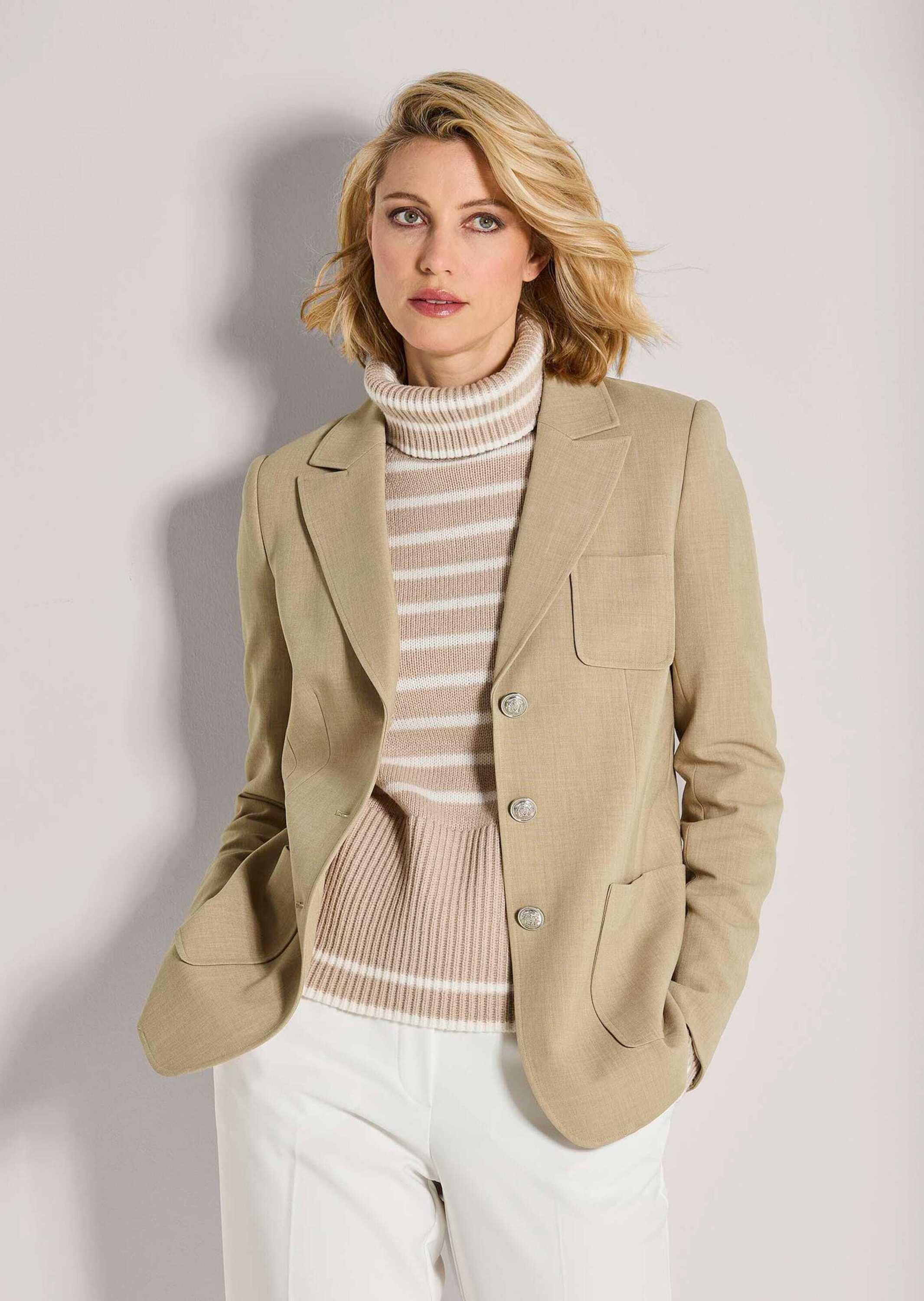Dieser Blazer zählt zweifellos zur Kategorie der Klassiker, die für Kombinationen von lässig bis elegant geeignet und aus keiner trendorientierten Garderobe wegzudenken sind. Ein Style für alle Fälle. Seine edle Melange-Qualität begeistert mit stilvollem Finish, das von silberfarbenen Wappenknöpfen brillant unterstrichen wird. Ein Einreiher für souveräne Auftritte, der sich ganz klassisch in leicht taillierter Longform präsentiert und angenehm zu tragen ist. Ein breiter Reverskragen und Ärmel mit geknöpftem Saumschlitz sind stiltypisch und daher gesetzt. Aufgesetzte Taschen schaffen Platz für das Nötigste und werden von einer kleinen Brusttasche ergänzt. Dekorative Ziernähte zeugen von viel Liebe zum Detail und runden den Style gekonnt ab.