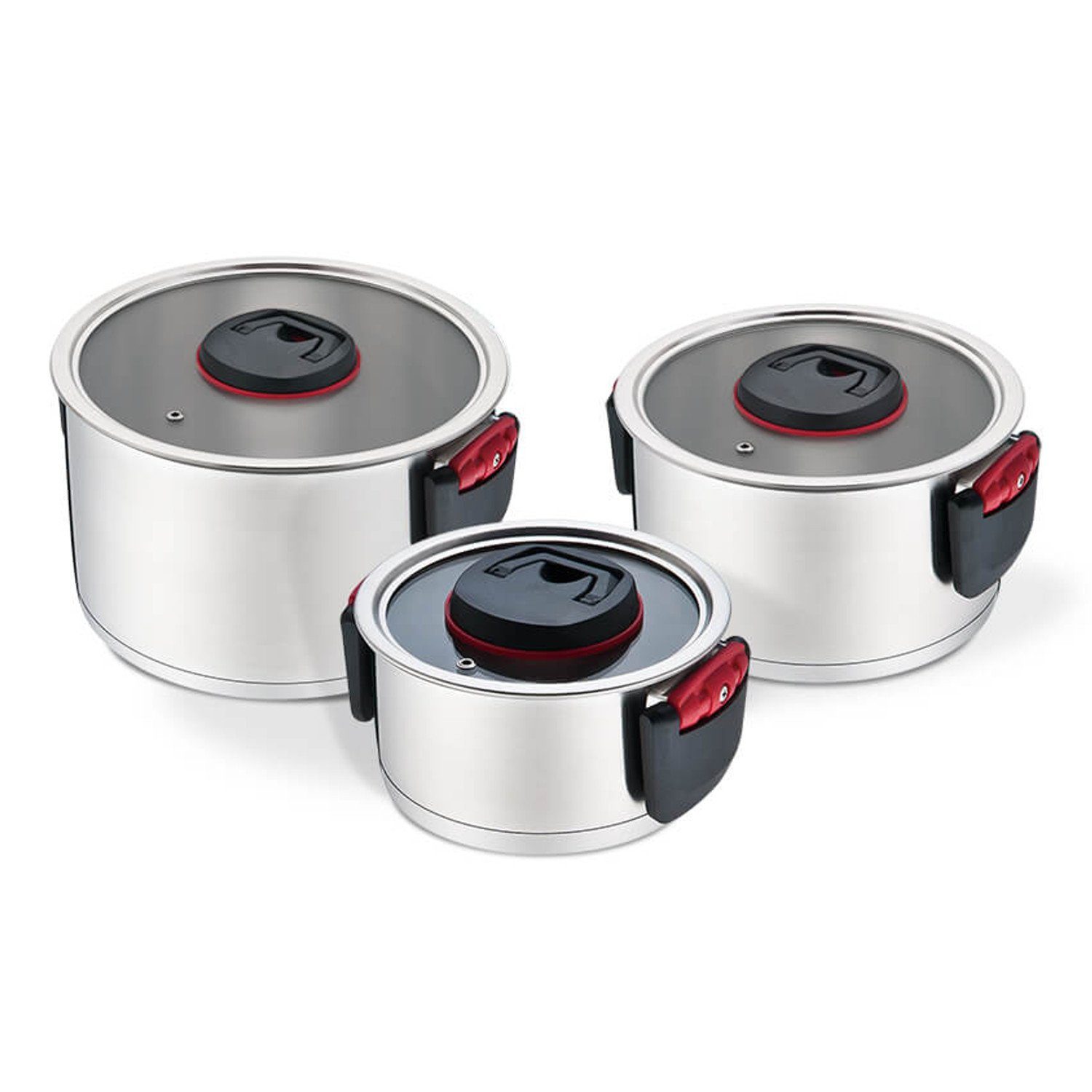 Das Topfset von 6 Stück MR-3530-6 ist ideal für alle, die Qualität und Funktionalität zu schätzen wissen. Jeder Topf in unserem Set ist aus rostfreiem Stahl gefertigt, was eine lange Lebensdauer und einfache Reinigung gewährleistet. Dank der Klappgriffe, reinigen Sie nach Gebrauch und stapeln überall. Все Töpfe haben Deckel. Dieser Satz von 6 Elementen MR-3530-6 ist nicht nur eine stilvolle Ergänzung für Ihre Küche, sondern auch ein funktionelles Gerät, das die Zubereitung jeder Mahlzeit erleichtert. Das Topfset ist für alle Herdarten geeignet und sorgt dafür, dass Sie schnell und gleichmäßig kochen. Das Set besteht aus 3 Töpfen mit unterschiedlichem Fassungsvermögen und 3 Deckeln, so dass Sie in der Küche völlig flexibel sind.