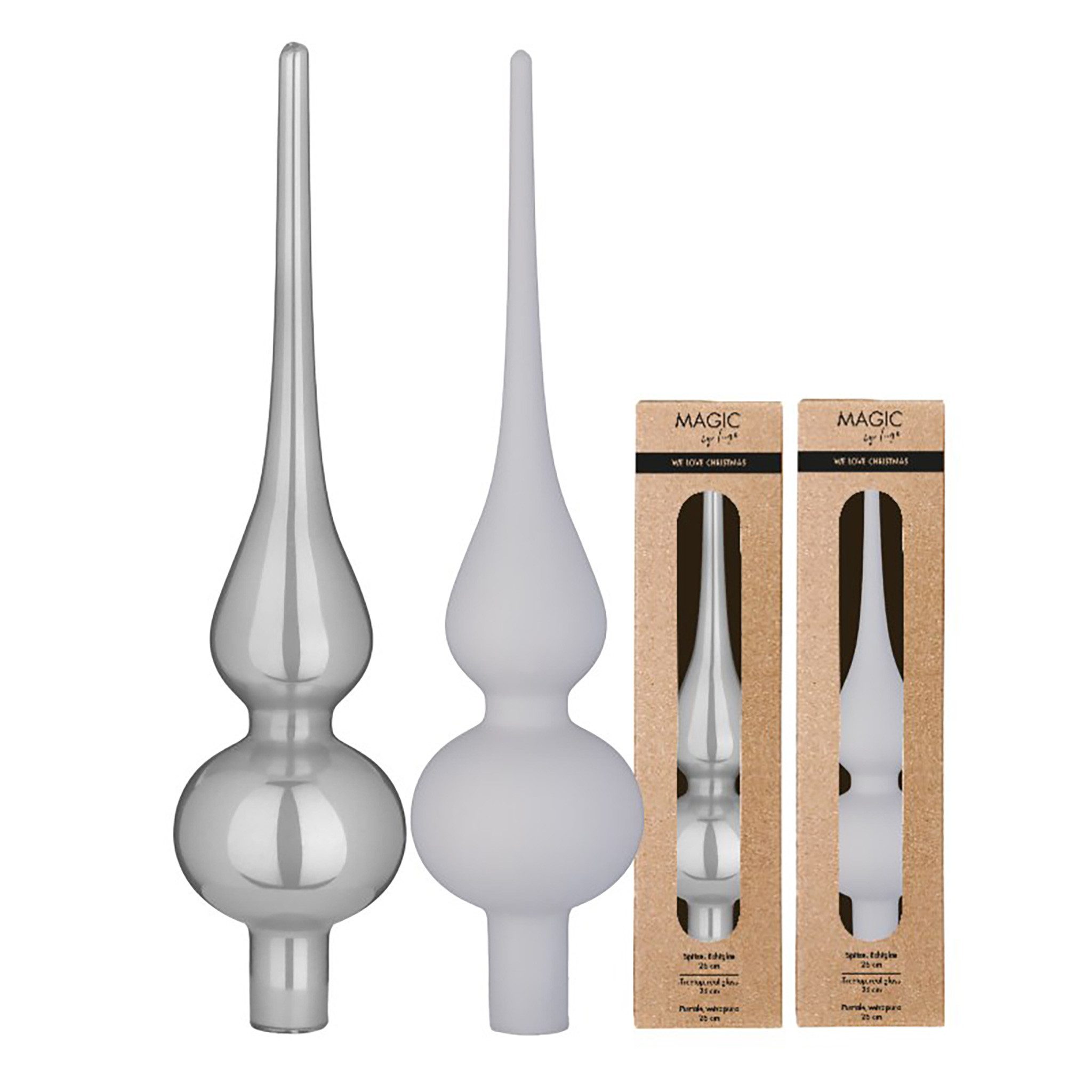 PRODUKT: Weihnachtsspitze / HÖHE: ca. 26 cm / DURCHMESSER: ca. 6 cm / MATERIAL: Glas / INHALT: 1 Spitze (Auslieferung nach Zufallsprinzip) / FARBTON: Mix aus silber und hellgrau -