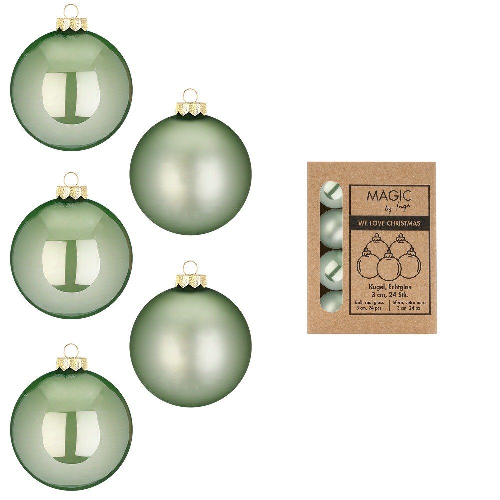 Christbaumkugeln / Weihnachtskugeln / Weihnachtsbaumkugeln Material: Glas - Durchmesser: ca. 3 cm - Packungsinhalt: 24 Weihnachtskugeln in Karton - Box - Farbton: salbei - salbeigrün - eukalyptus - mint - mintgrün - jade - jadegrün - lindgrün - pastellgrün Farbserie Mild Sage: Besonders im grauen Winter sehen wir uns nach frischen Farben. Warme Salbeigrüne-Töne schaffen eine beruhigende und entspannte Stimmung und verleihen dem Raum ein Gefühl von Frische und Natur. Schöne kleine Weihnachtsbaumkugeln aus echtem Glas, maschinelle Herstellung - In einer nachhaltigen Kartonbox mit Trennwänden, die als eine Aufbewahrungsbox verwendet werden kann Setzen Sie Ihren Weihnachtsbaum mit diesen mini Weihnachtskugeln in Szene. Der klassische Christbaumschmuck lässt sich beliebig mit anderen Weihnachtskugeln kombinieren. Doch nicht nur als Weihnachtsbaumschmuck eignen sich die Christbaumkugeln, sondern auch als Dekokugeln. Sie verschönern den Adventskranz oder die Festtagstafel. Stil & Aufmachung: uni & einfarbig - Farbgruppe: hellgrün - pastell grün - pastellfarben Die Farben können aufgrund von unterschiedlichen Monitor Einstellungen vom Foto leicht abweichen