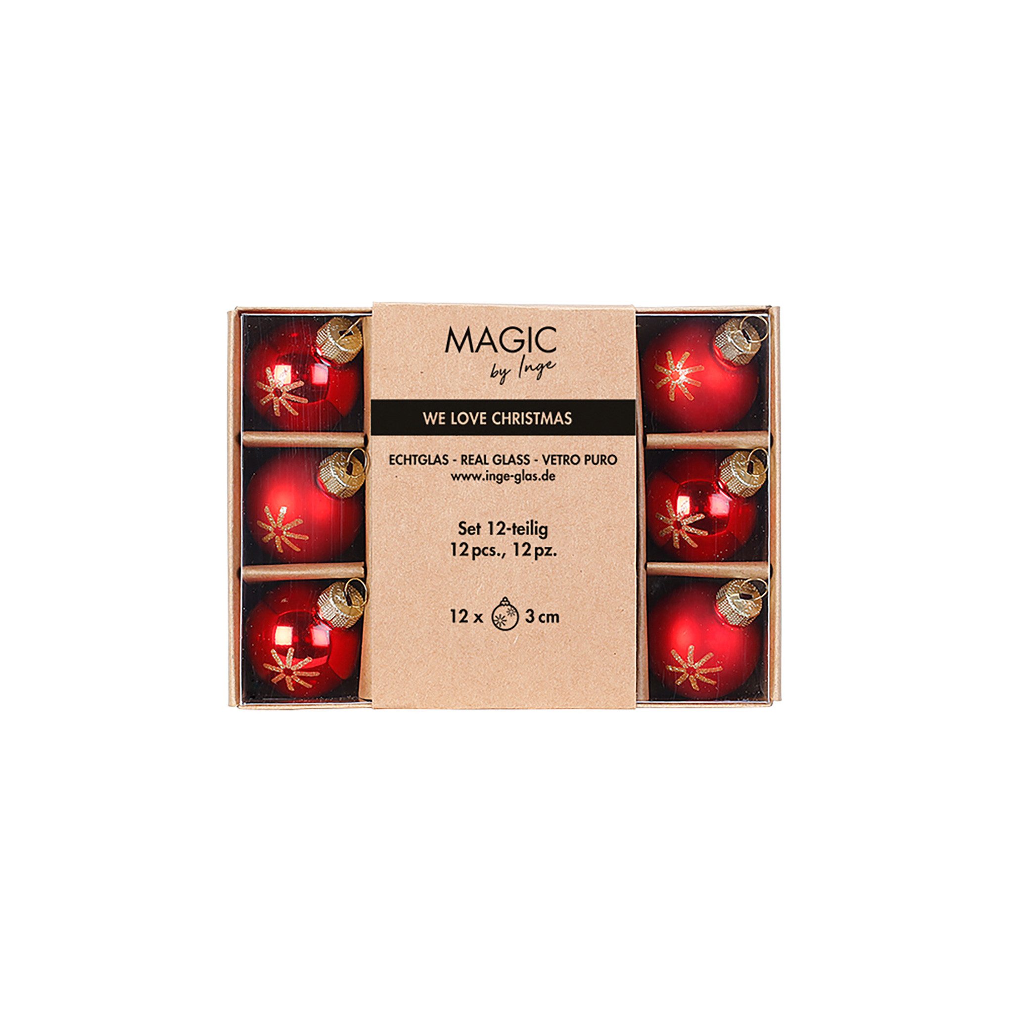 PRODUKT: Mini Weihnachtskugeln mit glitzerndem Muster / DURCHMESSER: ca. 3 cm / MATERIAL: Glas / INHALT: 12 Kugeln / FARBTON: weihnachtsrot - hellrot - knallrot - verkehrsrot