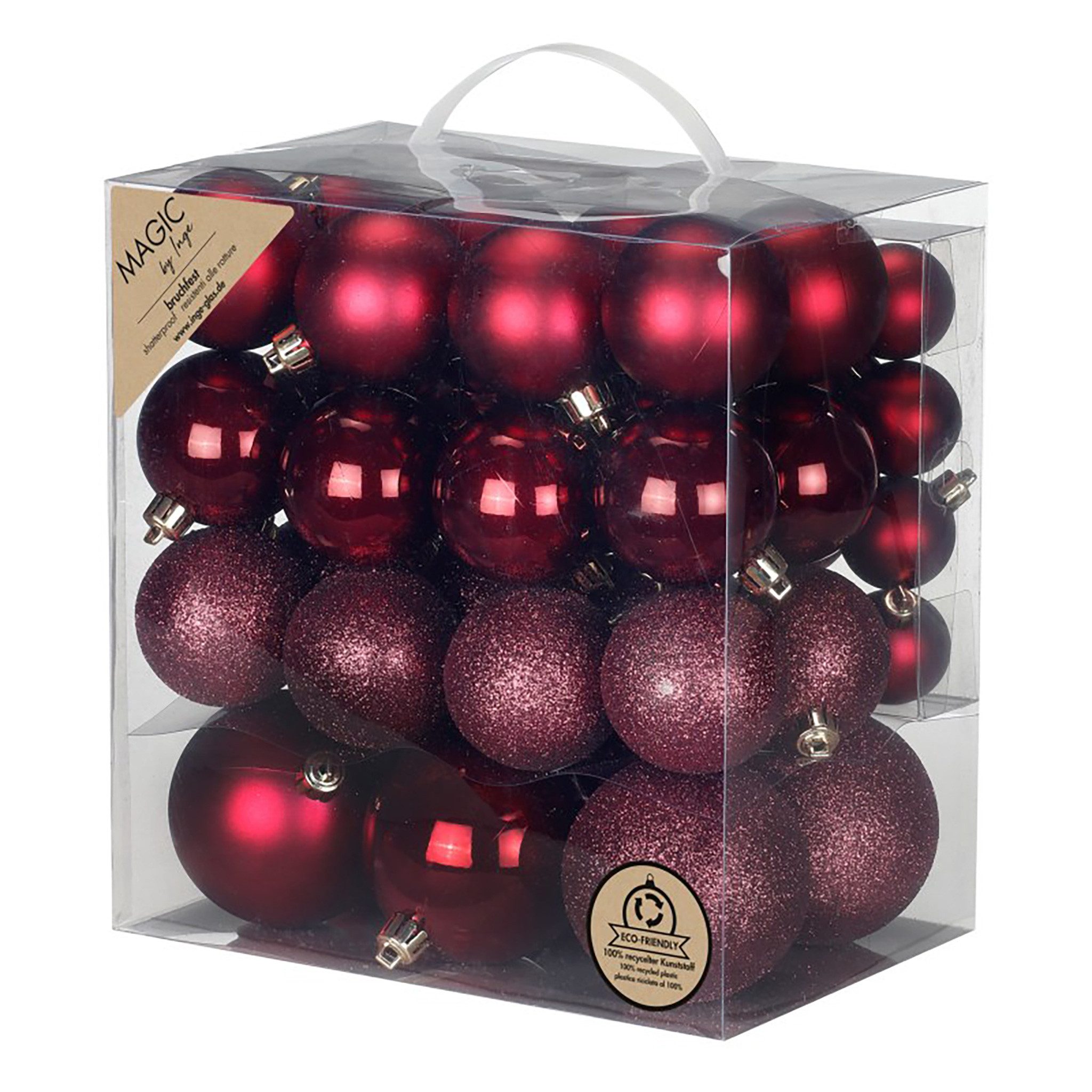 Christbaumkugeln / Weihnachtskugeln / Weihnachtsbaumkugeln Mix in unterschiedlichen Größen Material: Kunststoff - Plastik Größe: 6x 8cm, 24x 6cm, 24x 4cm Packungsinhalt: 54 Kugeln Farbton: dunkel weinrot - bordeaux - pflaume - beere - dunkelbordeaux Farbserie Bordeaux Red: Weinrot ist eine sinnliche und elegante Farbe, die an reifen Wein erinnert. Mit seinen tiefen Nuancen verleiht es jedem Raum eine raffinierte und luxuriöse Atmosphäre. Bordeaux strahlt gleichzeitig Kraft und Behaglichkeit aus, und verleiht jedem Raum eine zeitlose Eleganz. - Christbaumkugeln aus Kunststoff, bruchsicher - einfarbig, matt, glänzend und glitzernd gemischt Setzen Sie Ihren Christbaum mit diesen Weihnachtsbaumkugeln in Szene. Das Dekokugeln Set besteht aus matten, glänzenden und mit Glitzer verzierten Plastikkugeln, die für einen eleganten und abwechslungsreichen Look sorgen. Die Tannenbaumkugeln sind vielseitig einsetzbar, sei es als klassischer Christbaumschmuck, Weihnachtsanhänger oder Tischdekoration. Kunststoffkugeln sind eine hervorragende Alternative zu Glaskugeln, da kein Risiko von Glasbruch besteht, was sie praktisch und sicher macht. Somit eignet sich der bruchfeste Baumbehang aus Kunststoff ideal für Familien mit Kindern und Haustieren. Ob als traditioneller oder moderner Tannenbaumschmuck, diese Baumkugeln lassen sich hervorragend mit anderen Christbaumanhängern, Figuren und Weihnachtsschmuck kombinieren. Die Tannenbaumanhänger sind einfach zu befestigen und eignen sich perfekt, um den Tannenbaum oder die Festtagstafel zu verschönern. Die Weihnachtsbaum Deko ist auch eine wunderbare Geschenkidee für Freunde, Familie oder Kollegen zu Weihnachten. Überraschen Sie Ihre Liebsten mit diesem schönen Baumschmuck als Weihnachtsgeschenk. Figur & Form: Kugel, kugelförmig, rund Stil & Aufmachung: uni & einfarbig Farbgruppe: rot - bordeaux