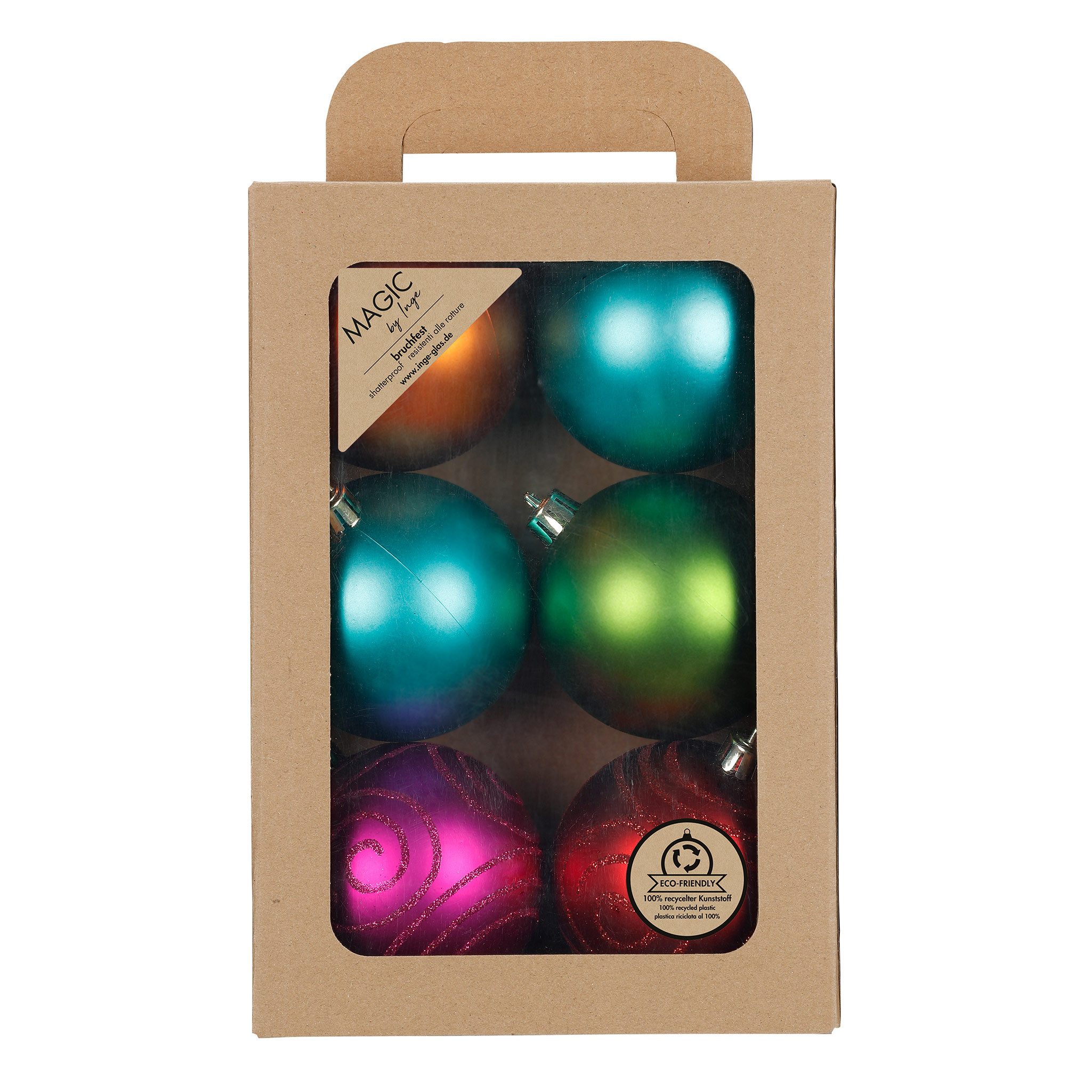 Christbaumkugeln / Weihnachtskugeln / Weihnachtsbaumkugeln mit Glitter Muster Material: Kunststoff - Plastik - Durchmesser: ca. 8 cm - Packungsinhalt: 12 Kugeln - Farbton: Bunt - Mix aus weihnachtsrot, hellgrün, türkis - hellblau, orange und fuchsia - magenta Farbserie Mille Fiori: ist ein an sich trendiger bunter Mix, der aber schon fast zum Klassiker geworden ist. Weihnachtliches Rot und Grün bekommen durch Türkis, Cyclam und Orange eine frische Note. Die Basis bei allen Farben ist entweder Rot oder Grün, so dass der Mix zwar bunt ist, aber trotzdem ausgewogen wirkt. - schöne Weihnachtsbaumanhänger, bruchsicher - einfarbig, matt und glitzernd gemischt - zum Aufhängen oder als Weihnachtsdeko zum Verschönern von der Festtafel Setzen Sie Ihren Christbaum mit diesen Weihnachtsbaumkugeln in Szene. Die Tannenbaumkugeln sind vielseitig einsetzbar, sei es als klassischer Christbaumschmuck, Weihnachtsanhänger oder als Tischdekoration. Kunststoffkugeln sind eine hervorragende Alternative zu Glaskugeln, da kein Risiko von Glasbruch besteht, was sie praktisch und sicher macht. Somit eignet sich der bruchfeste Baumbehang ideal für Familien mit Kindern und Haustieren. Ob als traditioneller oder moderner Tannenbaumschmuck, diese Baumkugeln lassen sich hervorragend mit anderen Christbaumanhängern, Figuren und Weihnachtsschmuck kombinieren. Die Plastikkugeln sind einfach zu befestigen und eignen sich perfekt, um den Tannenbaum oder die Festtagstafel zu verschönern. Entdecken Sie die Magie der Christbaumdeko und erleben Sie, wie sie Ihre Weihnachtsdekoration auf das nächste Level heben. Die Weihnachtsbaum Deko ist auch eine wunderbare Geschenkidee für Freunde, Familie oder Kollegen zu Weihnachten. Figur & Form: Kugel, kugelförmig, rund - Motiv & Muster: Spiralmuster, Glitzereffekt, filigrane Ornamentik, Wintermuster, geschwungene Linien, funkelnde Akzente - Stil & Aufmachung: uni & einfarbig - Farbgruppe: rot, grün, blau, orange und pink