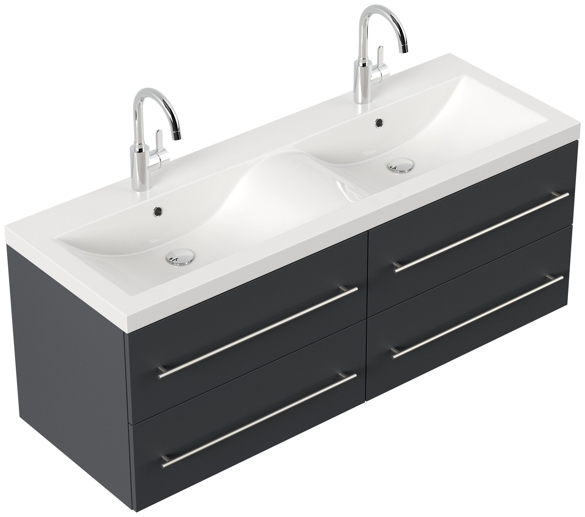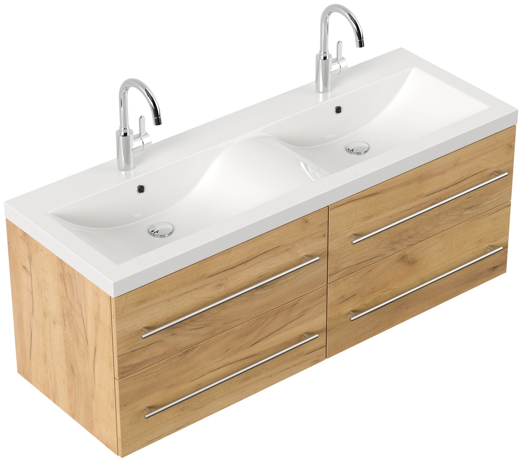 Die Ware wird zerlegt geliefert. Eine Aufbauanleitung liegt der Ware bei. Der Badunterschrank ist für die Wandmontage vorgesehen. Etwaiges Wandmontagematerial für die Aufhängung ist in der Lieferung nicht enthalten. Bitte verwenden Sie Schrauben und Dübel, die zu den Bedingungen bei Ihnen vor Ort passen. Das Waschbecken müssen Sie nicht extra an der Wand befestigen, sondern es wird auf den Unterschrank aufgesetzt. Die Montage wird mit einem Silikonstreifen zwischen Badmöbel und Waschbecken sowie Badezimmerwand optimiert. Der Anschluss für Ab- und Zulauf erfolgt wie üblich. Wir empfehlen, den Wasseranschluss von einer Fachfirma durchführen zu lassen.