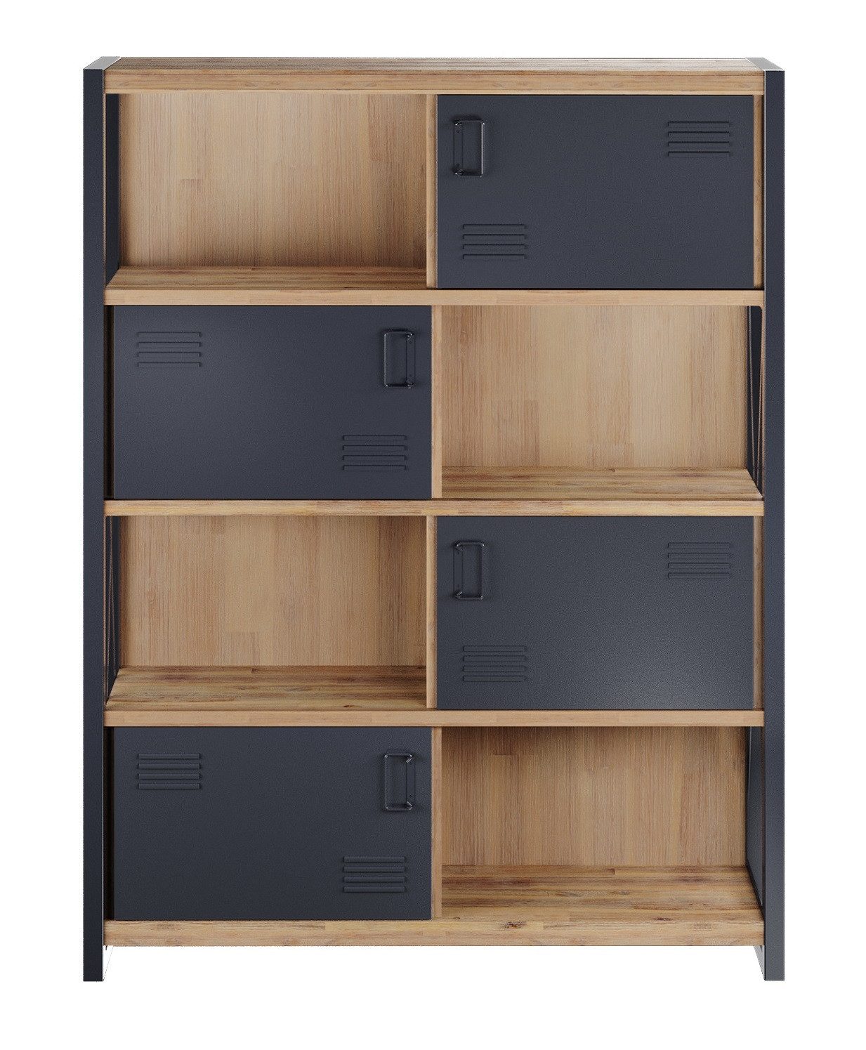 Das Standregal mit den Maßen 140x180 cm bietet großzügigen Stauraum und Funktionalität. Es verfügt über vier Metalltüren aus schwarz lackiertem Metall, die dem Regal einen modernen und markanten Look verleihen. Hinter den Türen befinden sich geräumige Fächer, die sich ideal zur Aufbewahrung von verschiedenen Gegenständen eignen.