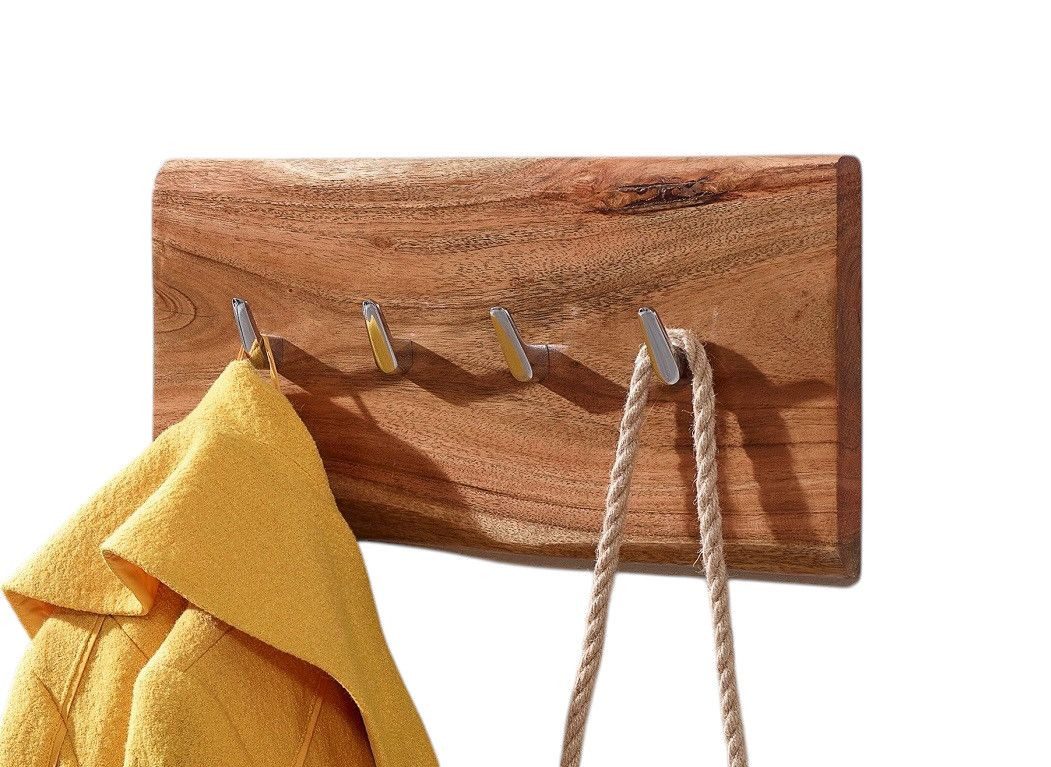 Die hochwertige Verarbeitung und das massiv honigfarbene Akazienholz verleihen der Garderobe eine warme und einladende Ausstrahlung. Die Metallhaken bieten ausreichend Platz zum Aufhängen von Jacken, Mänteln oder Taschen. Mit insgesamt 4 Haken hast du genügend Stauraum für deine Kleidungsstücke.