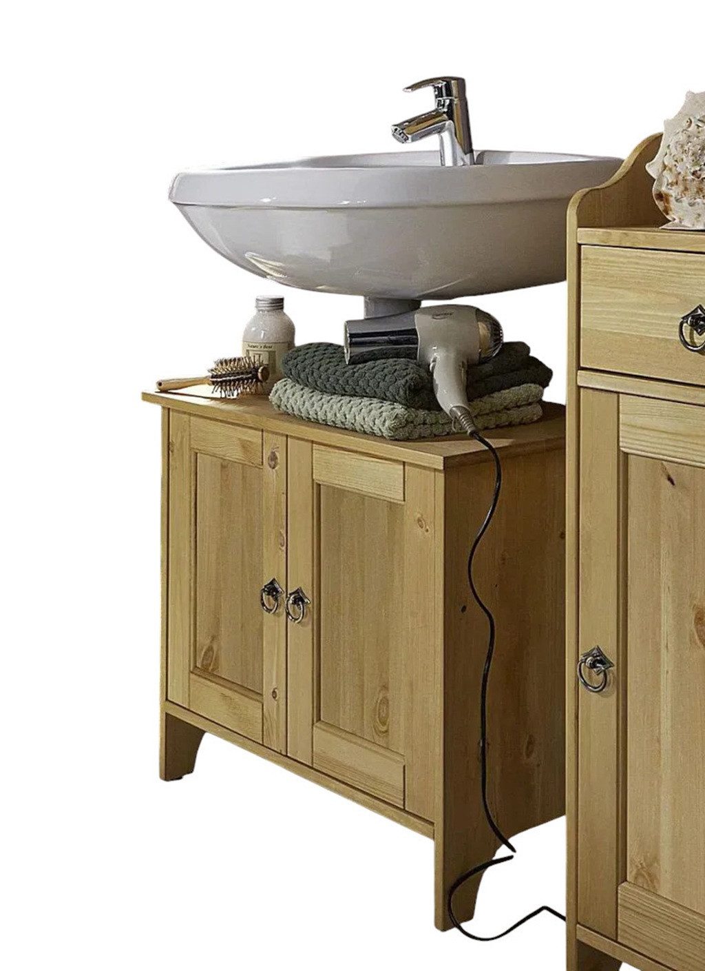 Der Waschbeckenunterschrank aus Massivholz bringt eine Höhe von 56 Zentimetern mit und kommt bereits mit Siphonausschnitt. Die Füße sind überdies noch höhenverstellbar und zwei Holztüren mit ansprechenden Metallgriffen bieten außerdem noch viel Stauraum unter dem Waschbecken, wo von Handtüchern über Hygieneartikel alles sicher aufbewahrt werden kann, was ins Badezimmer im Landhausstil gehört.