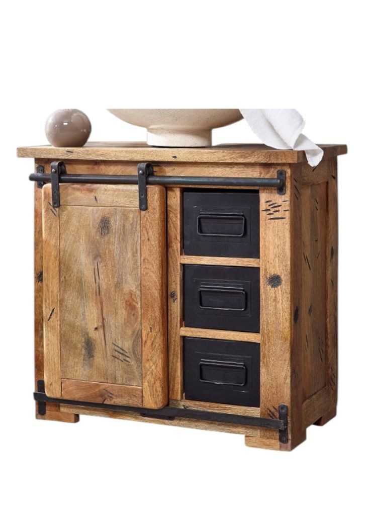 Selbstredend ist der Massivholz Waschbeckenunterschrank aber nicht einfach nur ein optischer Hingucker. Der Waschbeckenunterschrank Railroad besticht auch durch seine Funktionalität. Hinter der Schiebetür auf Eisenleisten, die ebenfalls im „Used-Look" gehalten ist und zum Zauber des Unterschranks beiträgt, ist ausreichend Platz für die wichtigsten Hygieneartikel und Badezimmerprodukte, die in Waschbeckennähe aufbewahrt werden wollen. Auf der einen Seite steht dafür ein Fach mit Einlegeboden bereit. Auf der anderen Seite gibt es gleich drei Schubkästen aus antik-schwarzem Eisen.