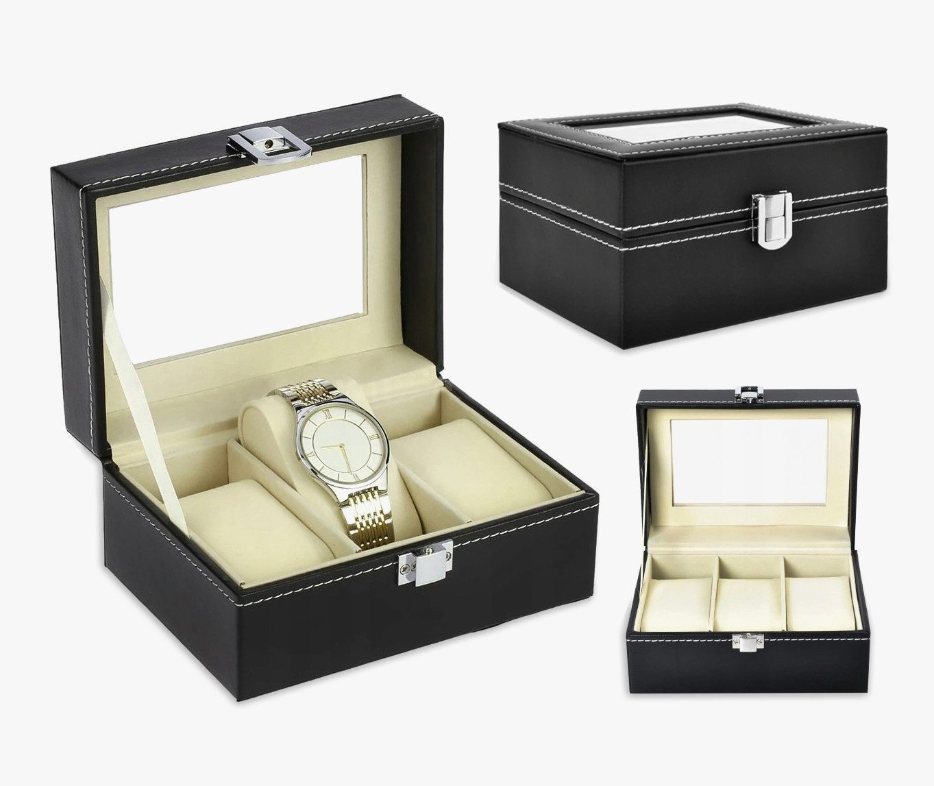 Der Uhrenorganisator mit 3 Fächern ist eine ästhetische und elegante Lösung für die stilvolle Aufbewahrung von Uhren, Schmuck und Accessoires. Hergestellt aus hochwertigem Öko-Leder mit weißen Besätzen, verfügt er über ein transparentes Deckel und ein weiches Innenfutter, das Ihre Gegenstände vor Kratzern schützt. Mit abnehmbaren Kissen und höheren Trennwänden bietet er Flexibilität und Sicherheit. Der Metallverschluss gewährleistet einen sicheren Verschluss, während das kompakte Design ihn ideal für zu Hause oder unterwegs macht. In stilvollem Schwarz und mit kompakten Maßen von 15,5 x 11 x 8 cm (zusammengeklappt) ist er eine praktische und elegante Lösung, die zu jedem Interieur passt. Mit seiner Vielseitigkeit und dem robusten Material ist er ein langlebiger und funktionaler Organisator, der Ihre wertvollen Gegenstände sicher aufbewahrt und präsentiert.