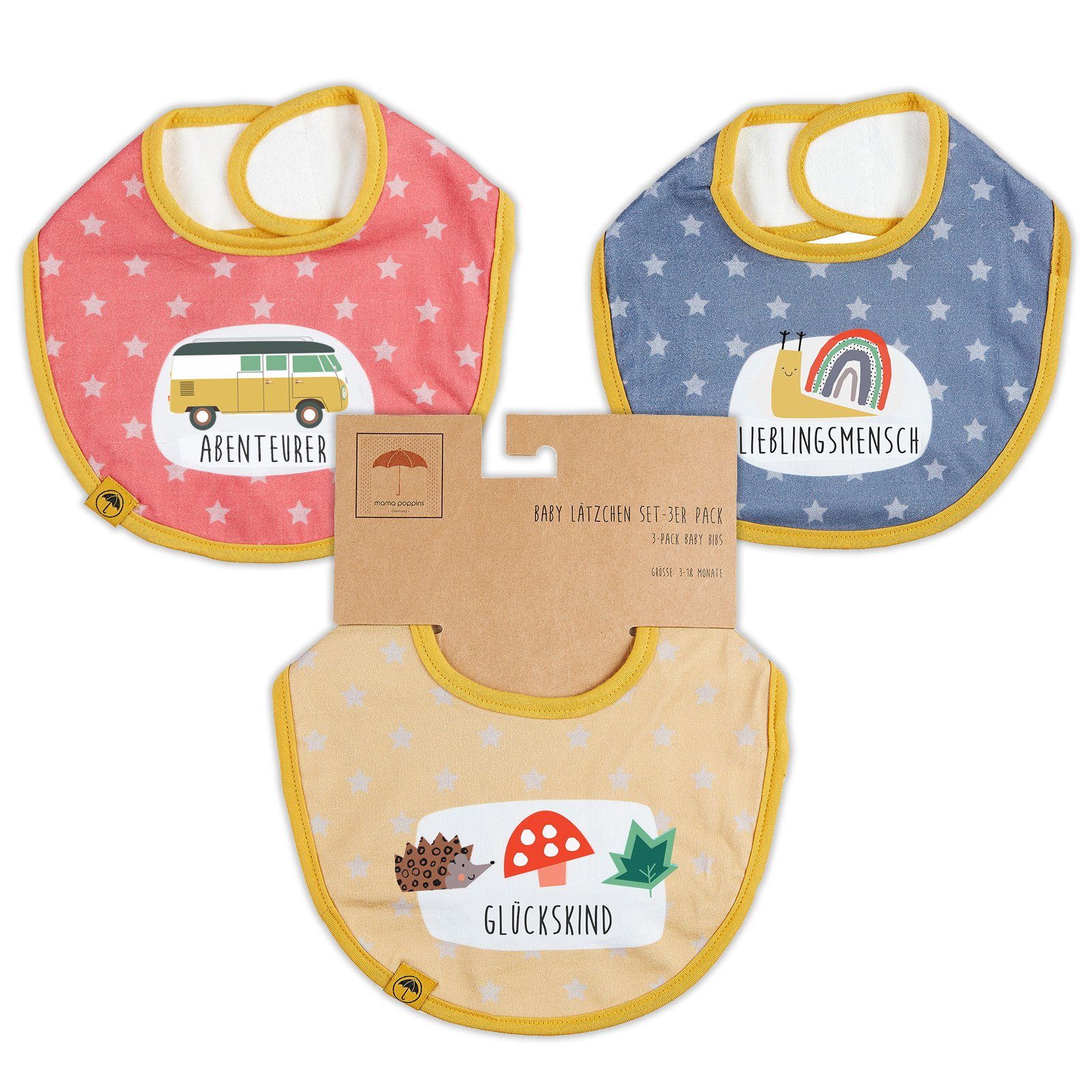 Hübsches Design. Praktische Handhabung durch Klettverschluss und perfekt für die Breischnute meiner Kleinen. Es muss aber vorbehandelt werden, sonst wird der Latz nicht richtig sauber nach dem waschen.