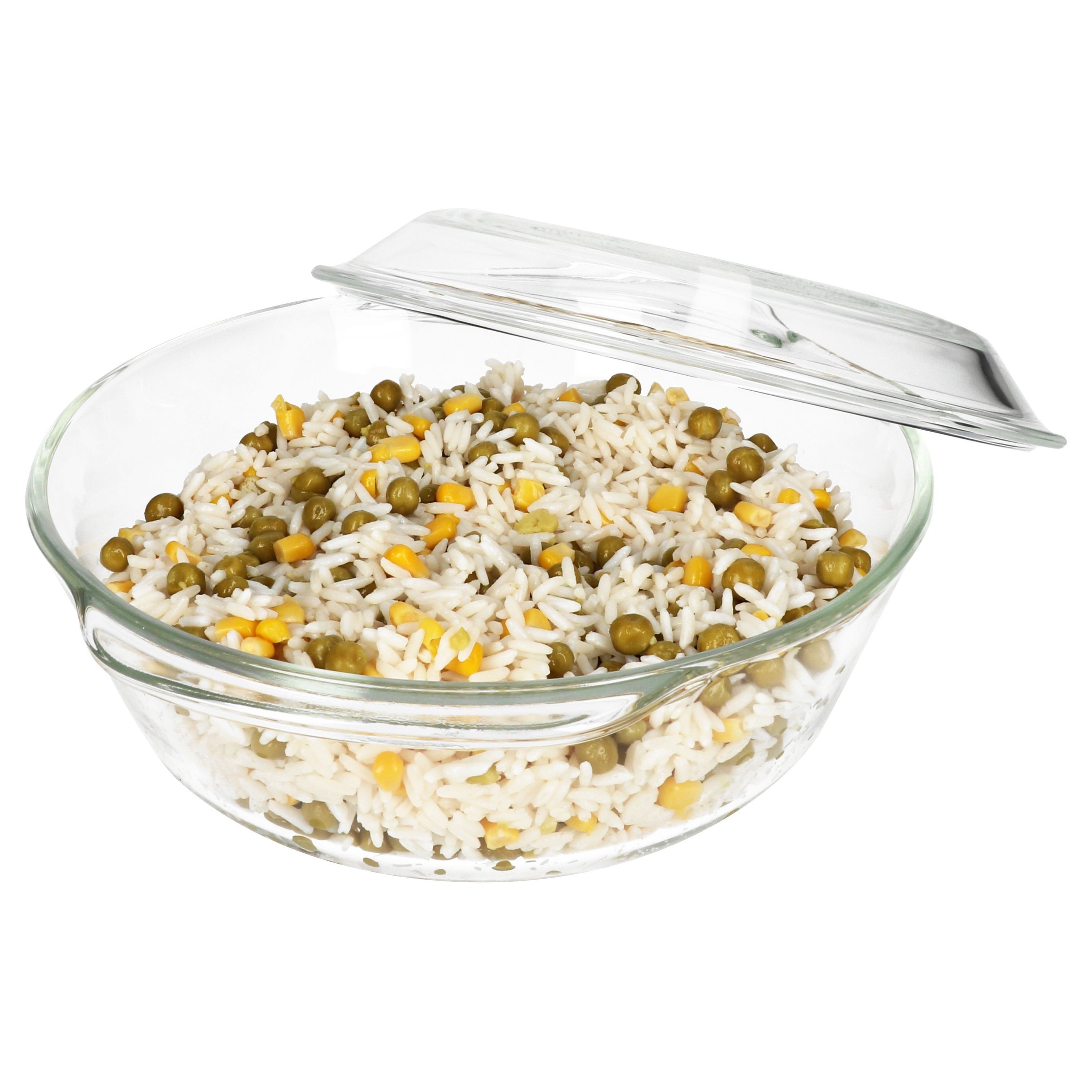 Die 2-teilige Form besteht aus einem flachen Deckel und einem größeren Glasbehälter, die entweder separat verwendet werden können oder in Kombination. Die runde Auflaufform ist aus Borosilikatglas gefertigt, wodurch diese die besten Eigenschaften wie Stabilität, Leichtigkeit und Unempfindlichkeit gegenüber hohen Temperaturen in sich vereint. Noch dazu sind sowohl beim Deckel als auch bei dem großen Behältnis links und rechts praktische Griffe angebracht, wodurch diese einfacher aus dem Ofen entnommen und von der Küche auf den gedeckten Tisch getragen werden können.