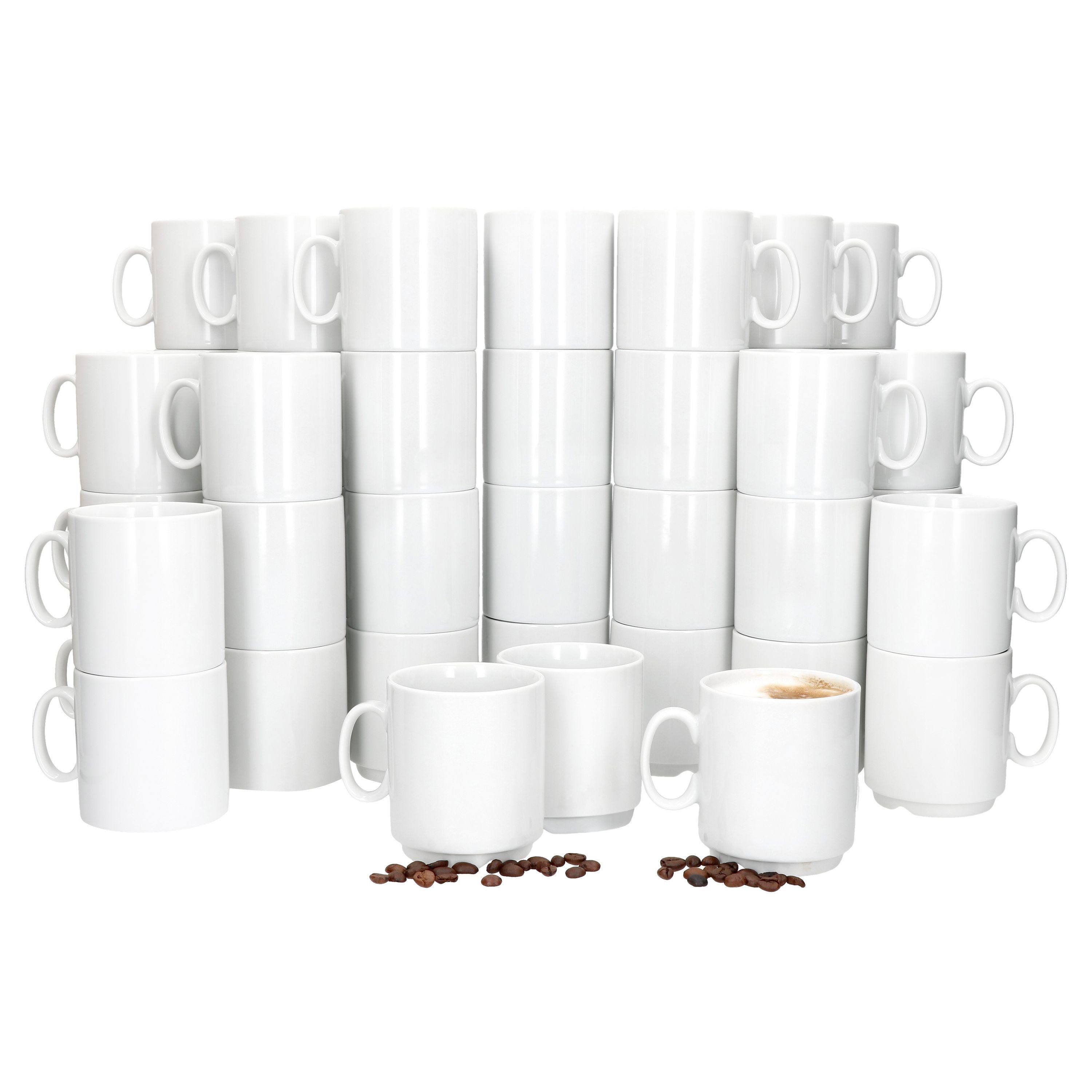 Hergestellt aus Porzellan, glänzen die Becher mit Robustheit und Langlebigkeit und bereiten Ihnen immer aufs Neue Freude beim Servieren. Zudem können die Tassen platzsparend verstaut werden, da sie ineinander gestapelt werden können. Noch dazu sind sie spülmaschinengeeignet und im Handumdrehen wieder sauber. Außerdem sind sie mikrowellengeeignet, was auch das Erwärmen von z. B. Kakao in dem Becher möglich macht.