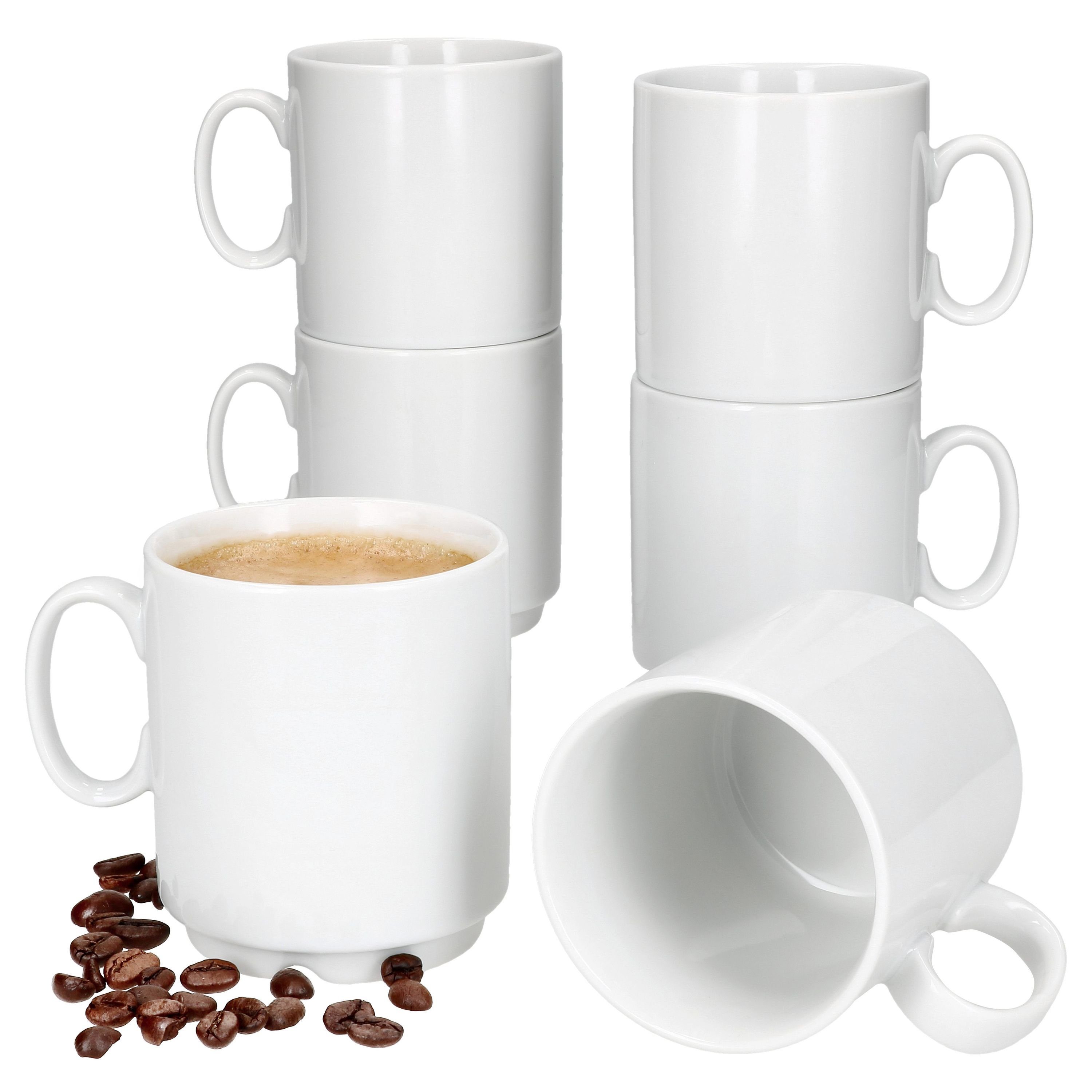• MamboCat 6er Set weiße Event Kaffeebecher 250 ml runde stapelbare Tassen mit Henkel Das Set ist aus robustem und langlebigem Porzellan gefertigt und für bis zu 6 Personen