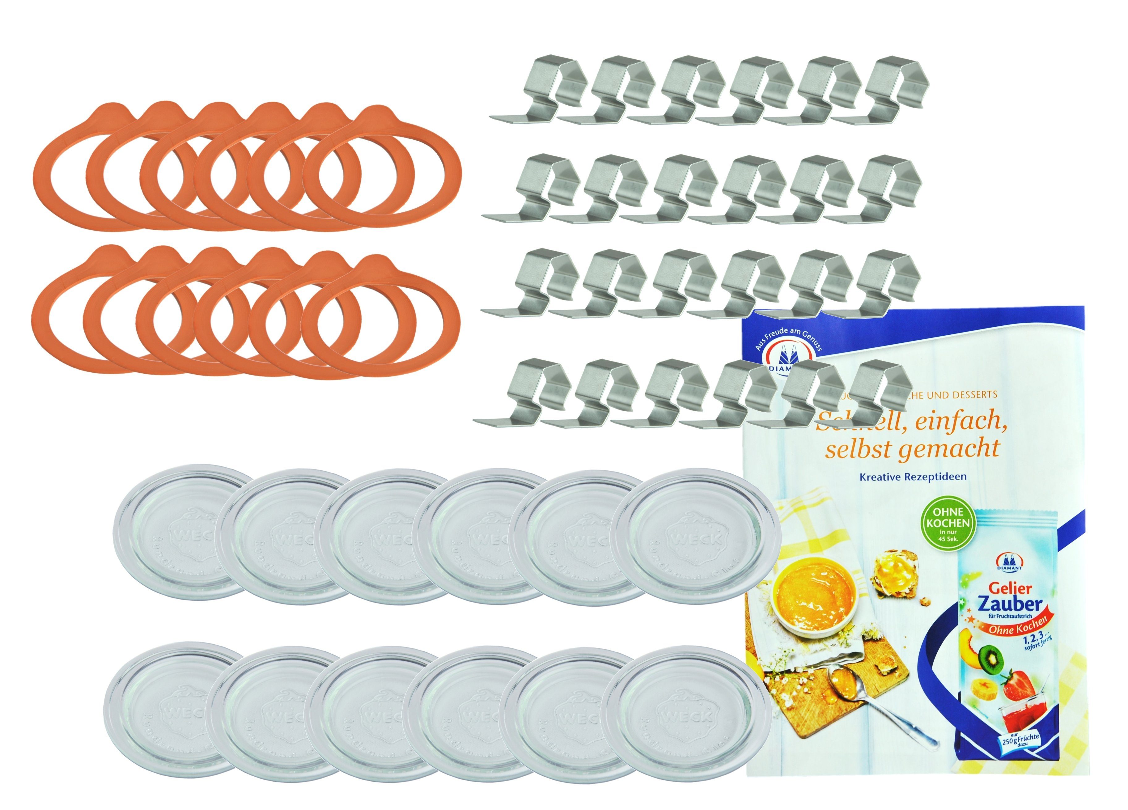 ORIGINAL WECK-Einkoch-Set - 12 Glasdeckel für Rundrandglas 100 mm + 12 Einkochringe + 24 Weck-Klammern + GRATIS Rezeptheft, Ersatzdeckel aus Glas, transparent, WECK-Rundrandgläser RR100, wiederverwendbar
