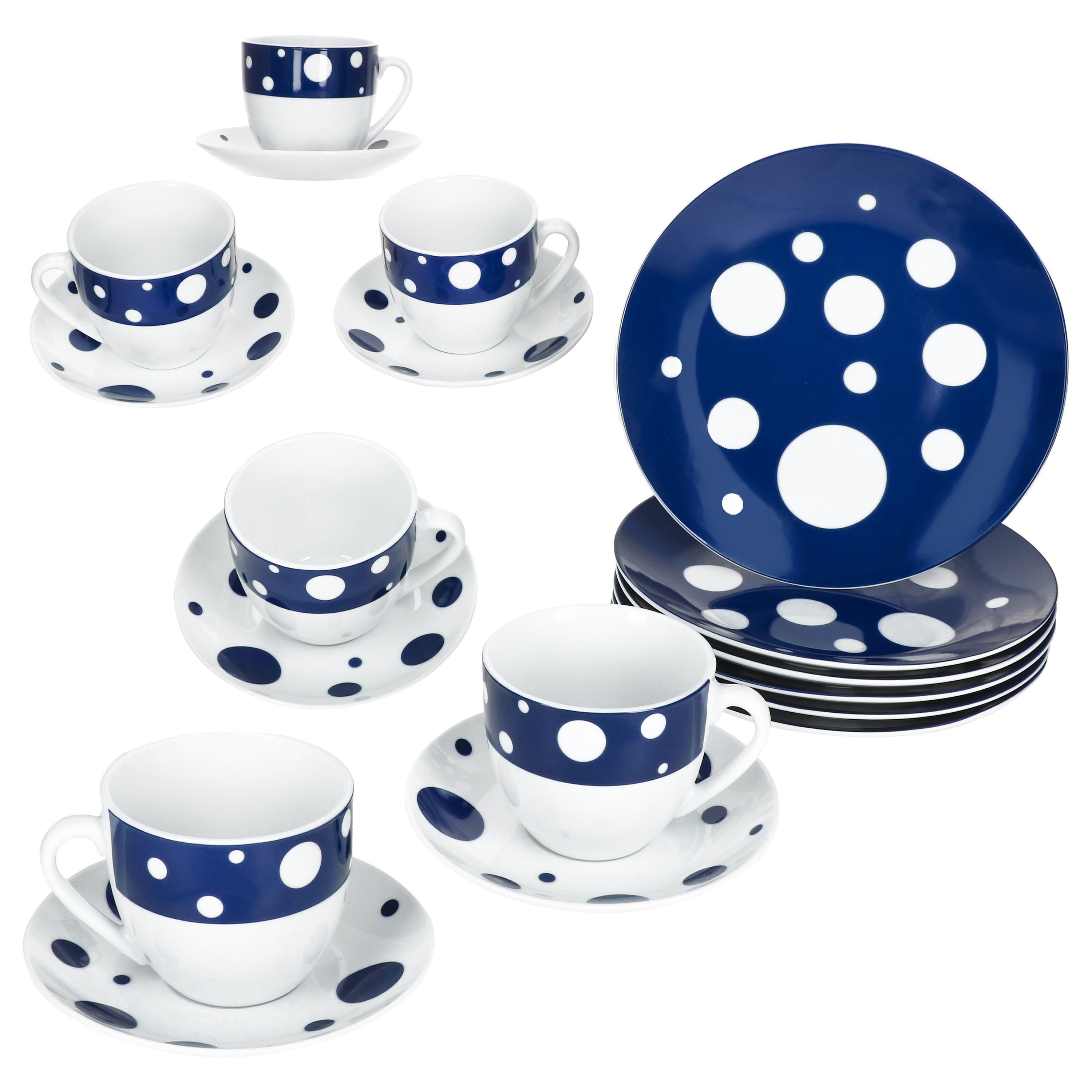 Genießen Sie das fröhliche und farbenfrohe 18-teilige Kaffeeservice Pula dunkelblau aus Porzellan und hauchen Ihrem Tisch mit diesem aufeinander abgestimmten Set Leben ein.
