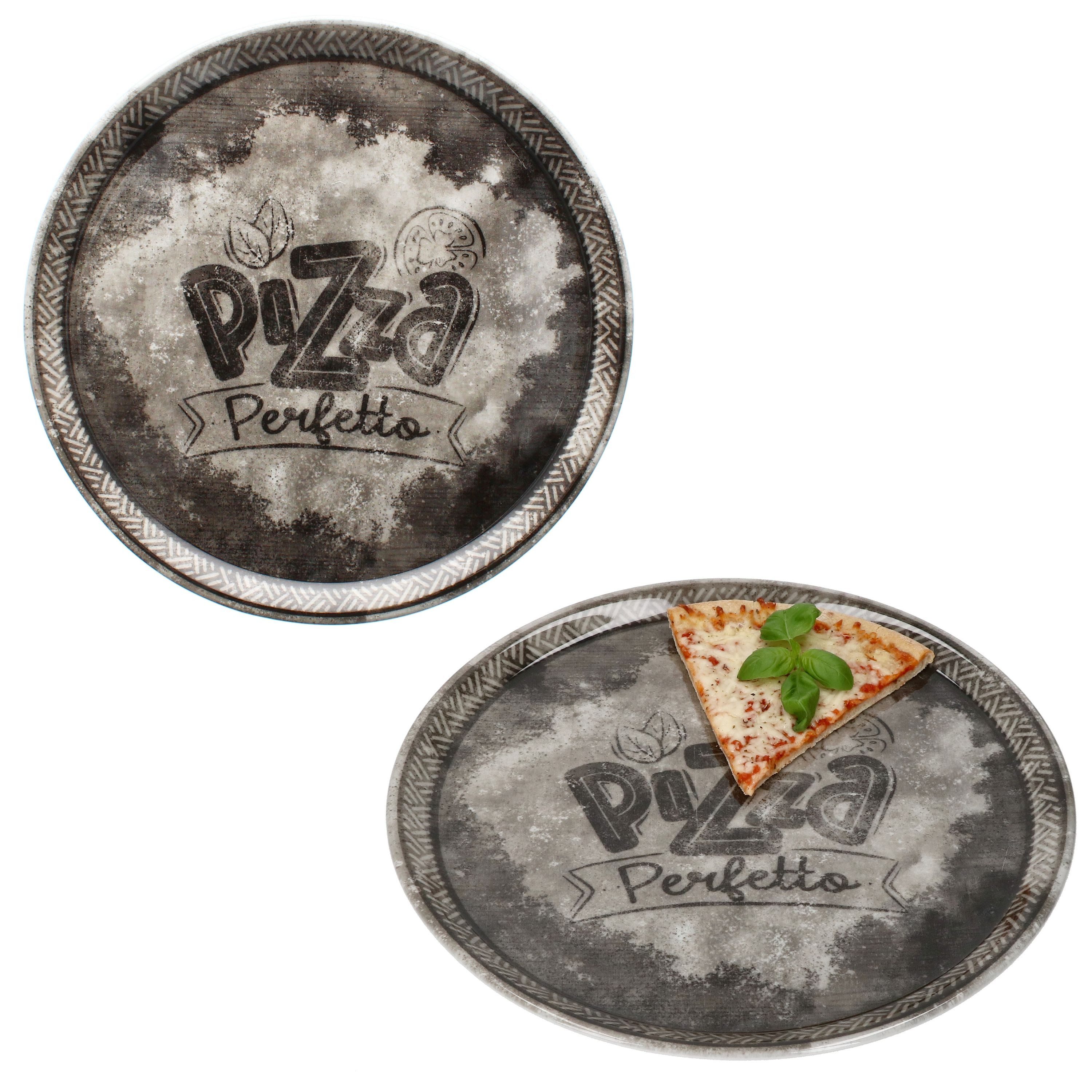 Das Pizzateller-Set PERFETTO bringt italienisches Flair auf den Tisch! Das 2er Set Pizzateller überzeugt durch rustikale Optik in Schwarz mit auffälligem PIZZA PERFETTO Schriftzug – ideal für gemütliche Abende mit Pizza, Flammkuchen oder Antipasti.