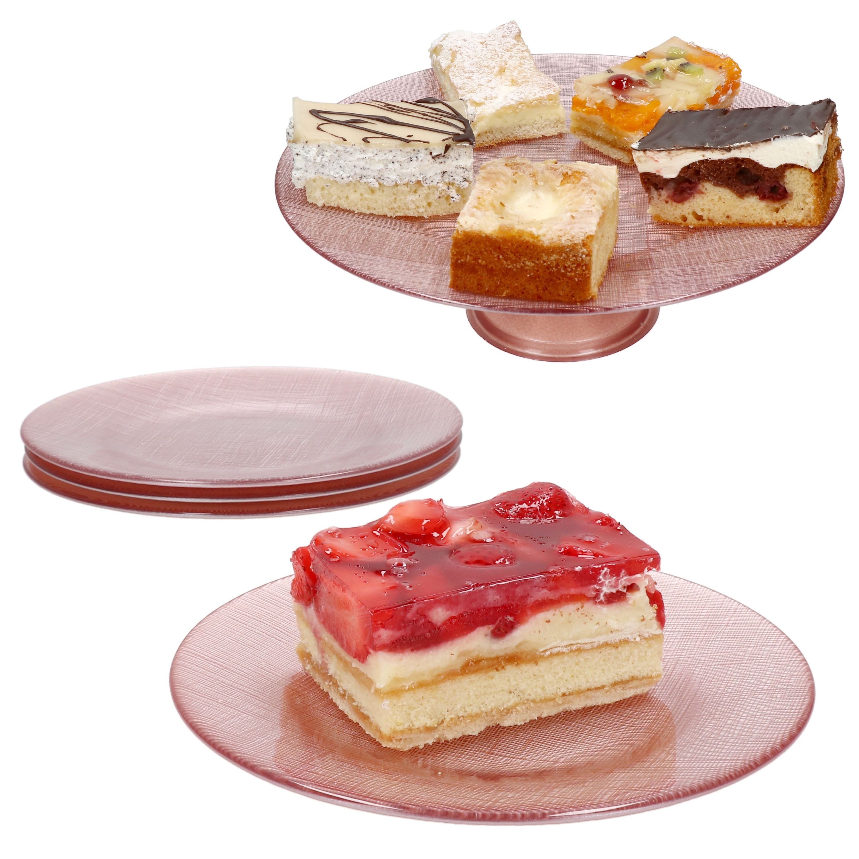 Dieses stilvolle 5-teilige Set CAMINO besteht aus einer eleganten Tortenplatte und vier passenden Desserttellern aus hochwertigem Glas. Das rosafarbene Design mit strukturierter Oberfläche sorgt für einen modernen und zugleich charmanten Look auf jeder Tafel. Die Tortenplatte bietet ausreichend Platz für Torten, Kuchen und andere Leckereien, während die Dessertteller sich ideal für Gebäck, Kuchenstücke oder kleine Snacks eignen.