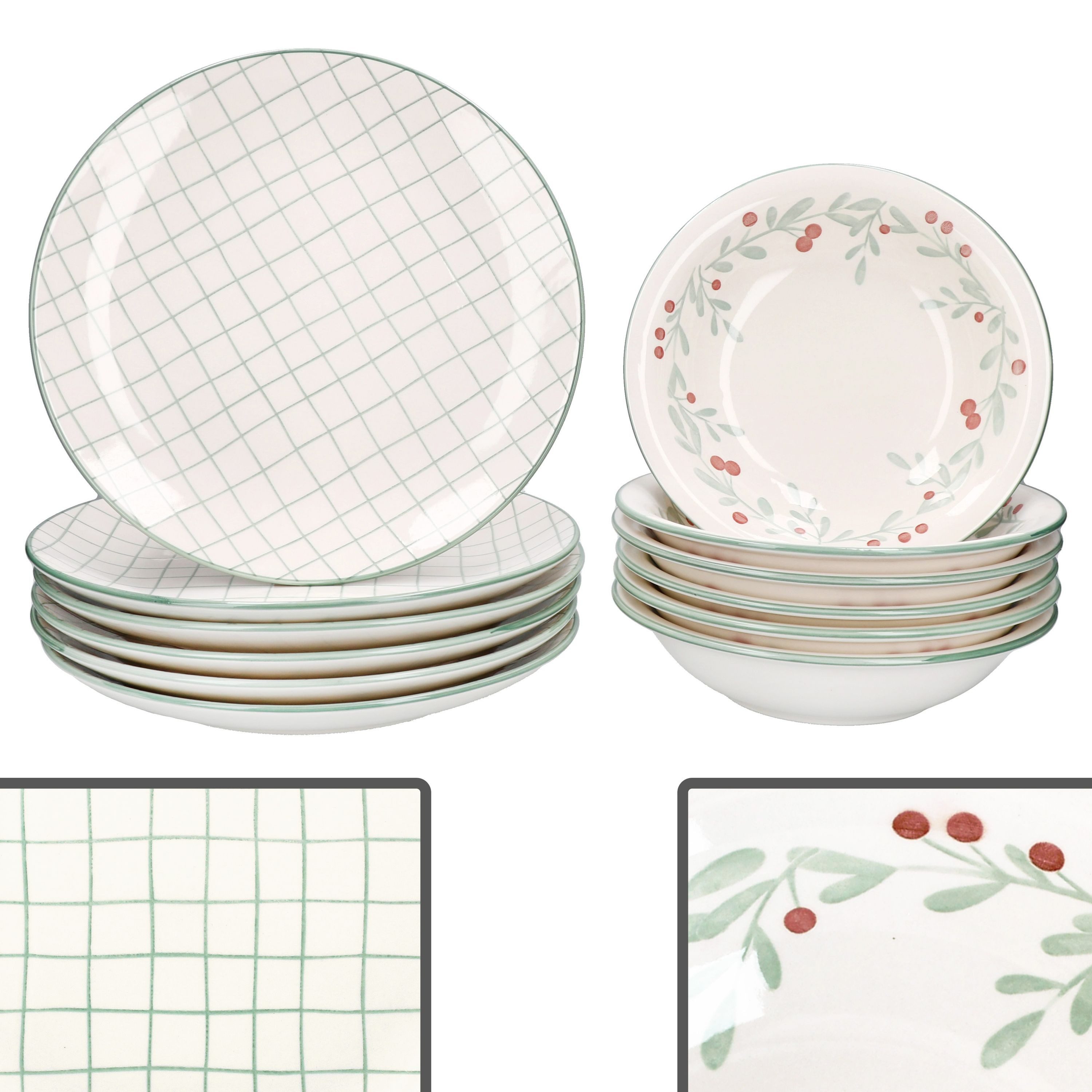 Die großen und tiefen Teller sind in einem cremefarbenen Grundton gehalten. Innen beim Suppenteller ist ein breites Band mit vielen kleinen und großen grünen Mistelzweigen sowie roten Beeren zu sehen, wodurch die Teller für ganz besondere Akzente auf Ihrem gedeckten Tisch sorgen. Der Speiseteller hingegen ist über die gesamte Tellerfläche mit einem unregelmäßigen grünen Gitter-Muster verziert. Sowohl beim Suppen- als auch bei Essteller wird alles noch von einem grünen Rand umschlossen und rundet so das Design perfekt ab.