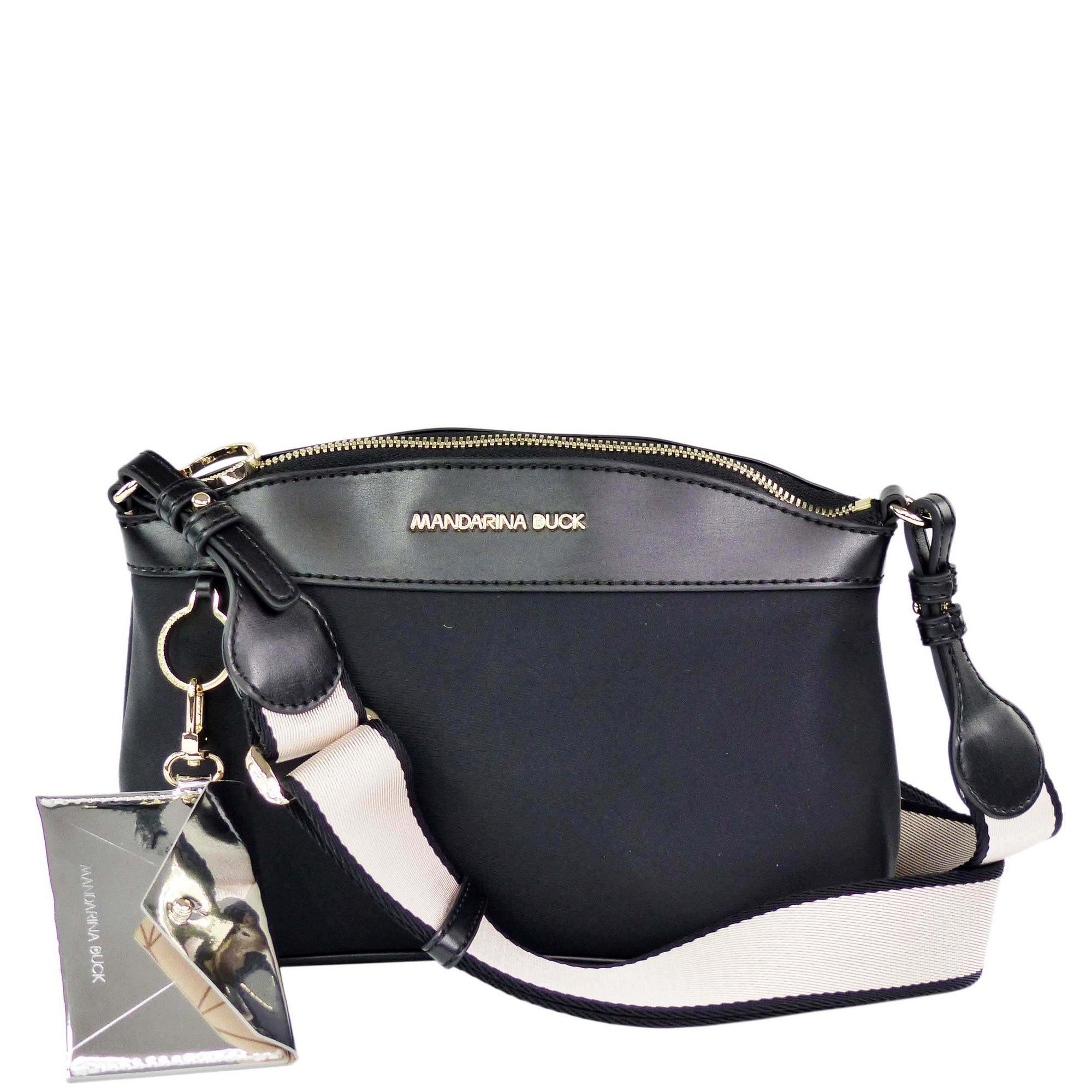 Eine stilvolle und elegante Umhängetasche von Mandarina Duck in Schwarz. Sie wurde aus dem Material von strapazierfähigem Nylon mit Kunstleder Details hergestellt. Die Mandarina Duck Bijou MKT07 Umhängetasche ist mit Schmuckdetails verziert; ein abnehmbarer Kartenanhänger in metallischem Effekt-Material ud der Zipper, dessen Form der Ohrringen ähnelt. Sie ist für die Abende und besondere Anlässe ein perfekter Begleiter.