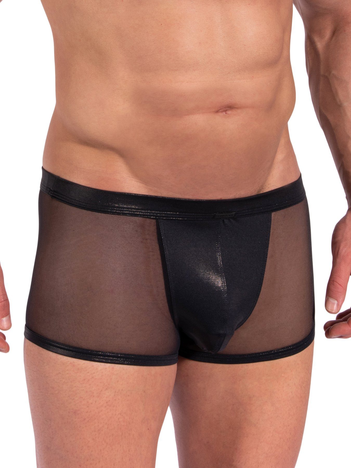 MANSTORE - passend zu allen, die sich gern provokativ und abseits vom Mainstream in Szene setzen: Bei M2367 wird mit Hochglanz und Transparenz gespielt. Die String Pant schimmert vorn, am hinteren Stringstrap und an den Abschlüssen in schwarzer Lackoptik, der Rest wurde mit transparentem Tüll ergänzt.