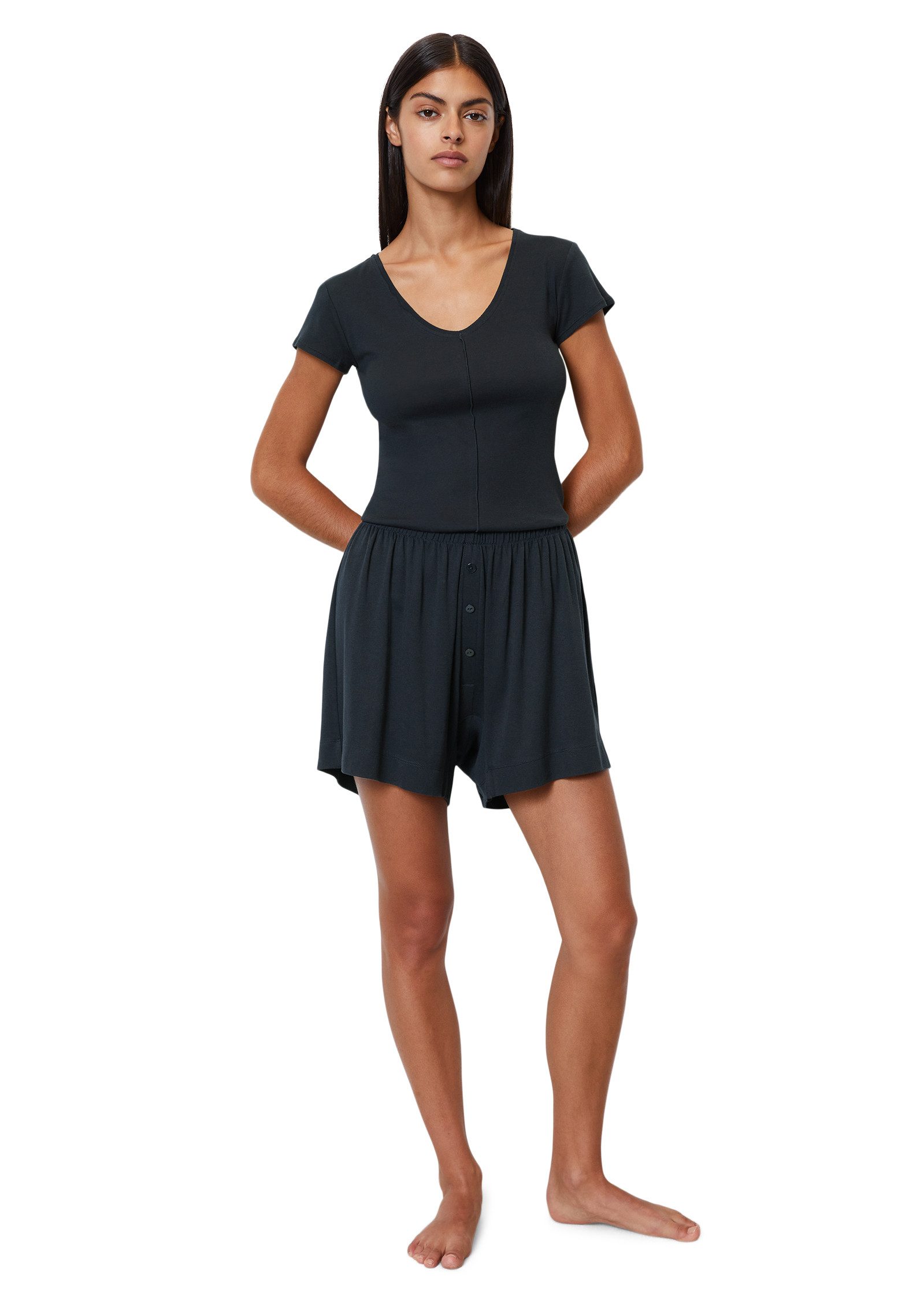 Eine gute Figur machst du in den Shorts »Soft Sensation« von Marc O'Polo beim Faulenzen zu Hause: Die Kombination aus Hose und Stiefeln mit lockerem Schaft ergibt ein besonders cooles Outfit, das zu einem XL-Shirt harmoniert.