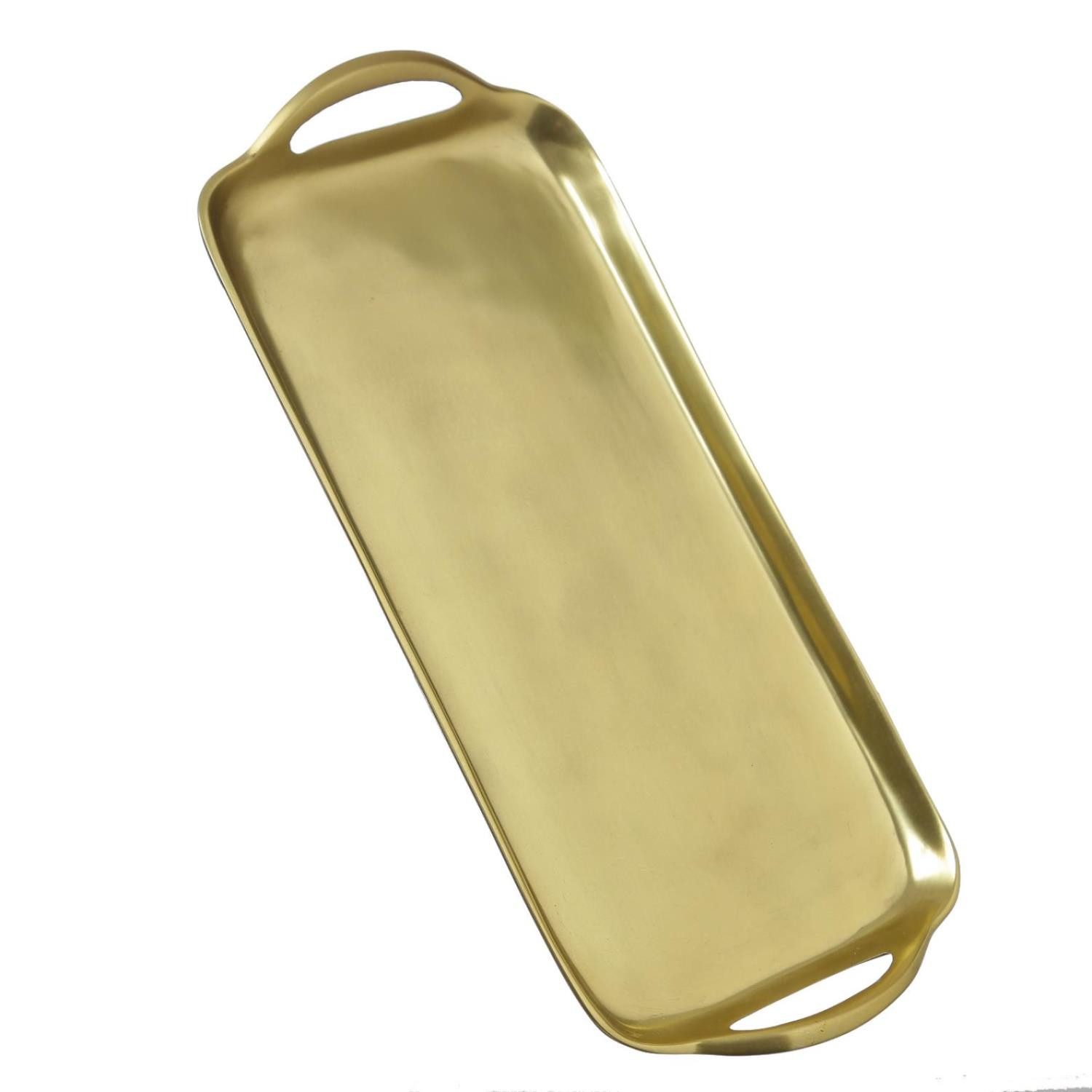 Du bist auf der Suche nach stilvollen Dekorationsideen? Dann solltest du Dir dieses elegante goldene Tablett mit Griffen genauer anschauen! Mit einer Длина von 36cm ist es das perfekte Dekotablett, um kleine Gegenstände, Kerzen oder Blumen darauf zu arrangieren. Das rechteckige Serviertablett ist aus hochwertigem gold eloxiertem Aluminium gefertigt und passt dank seines zeitlosen Designs perfekt in jeden Raum.