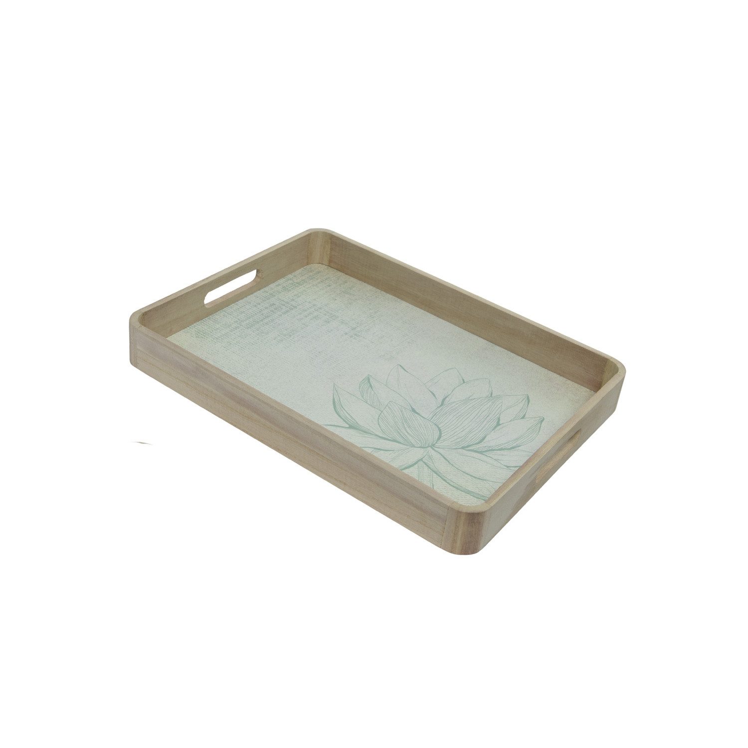 Das Tablett aus Holz mit der weißen Fläche und dem grünen Lotus ist genau richtig zum Anrichten und Servieren von Speisen. Aber auch Kerzen und andere Dekoration sehen auf dem Tablett einfach genial aus.