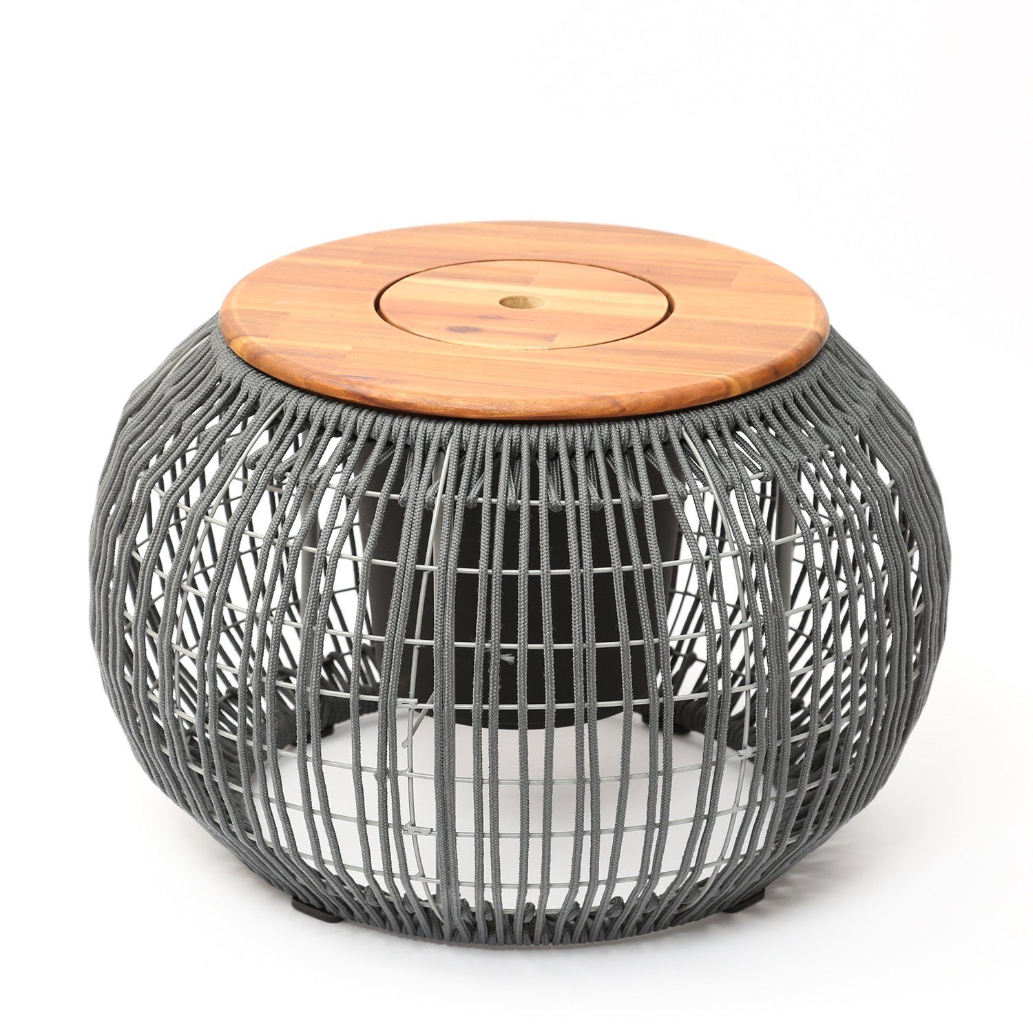 Dieser Garten Beistelltisch mit einer Höhe von 37cm kommt in einem modernen Design daher. Die grauen Kunststoffseile und der Deckel aus Akazienholz sorgen für einen tollen Blickfang in Deinem Garten, auf der Terrasse oder dem Balkon.