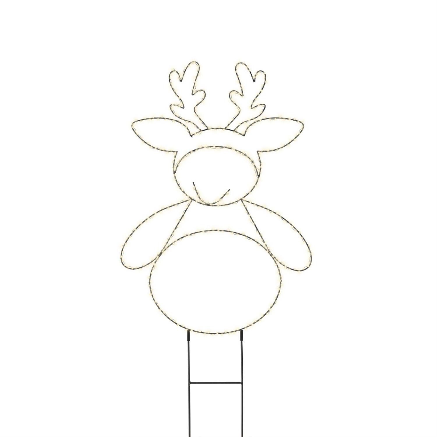 Dieser LED Gartenstecker als Rentier ist in der Weihnachtszeit ein echter Hingucker in Deinem Vorgarten, in Blumentöpfen, Balkonkästen oder im Blumenbeet im Garten. Die Drahtlichterkette mit den 450 warmweißen LED schlängelt sich um das schwarze Gestell des Rentiers und leuchtet einfach wunderschön.