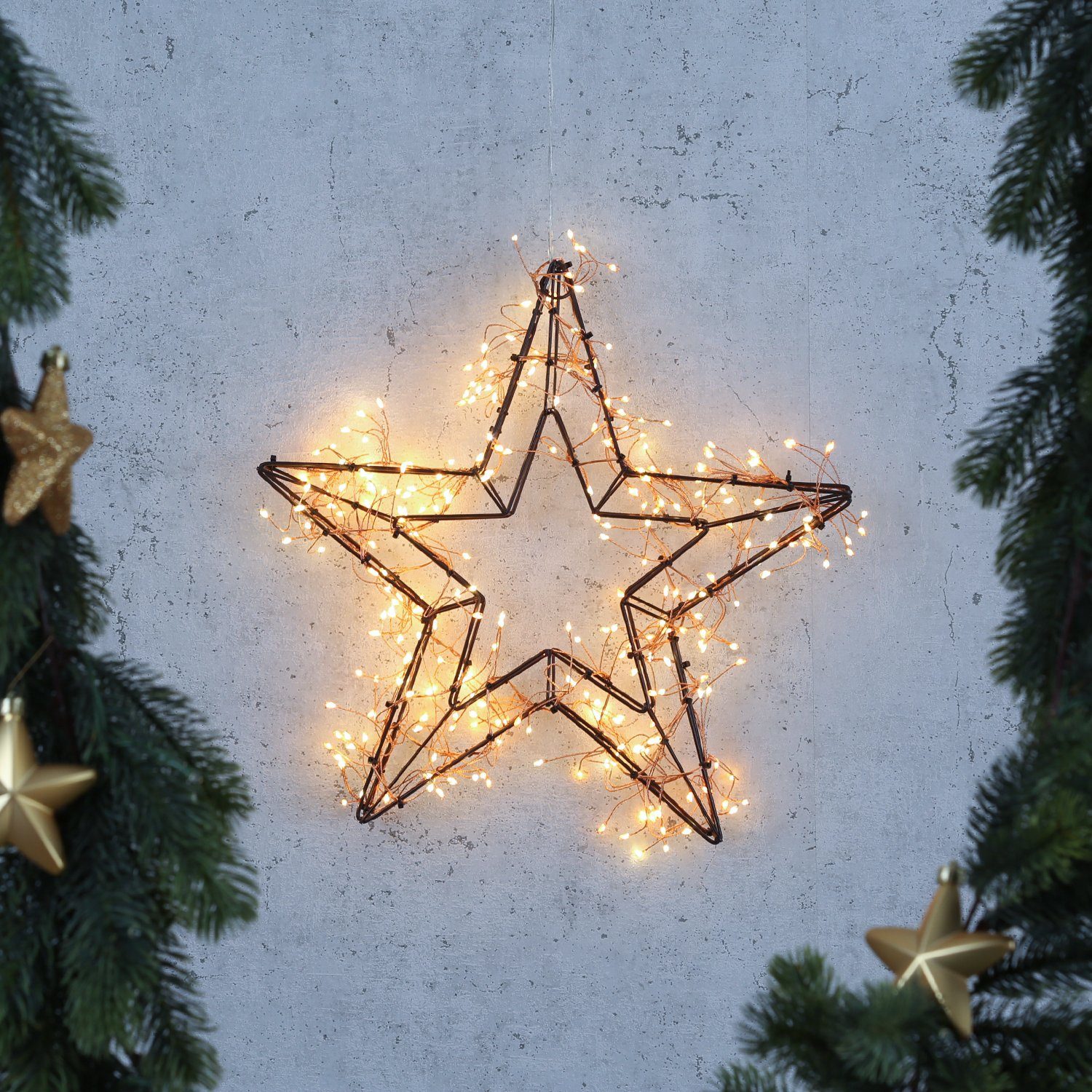 Genial sind die jeweils 150 warmweißen und 150 bernsteinfarbenen LED an der kupferfarbenen Drahtlichterkette. Diese lassen den schwarze LED Metallstern strahlen!