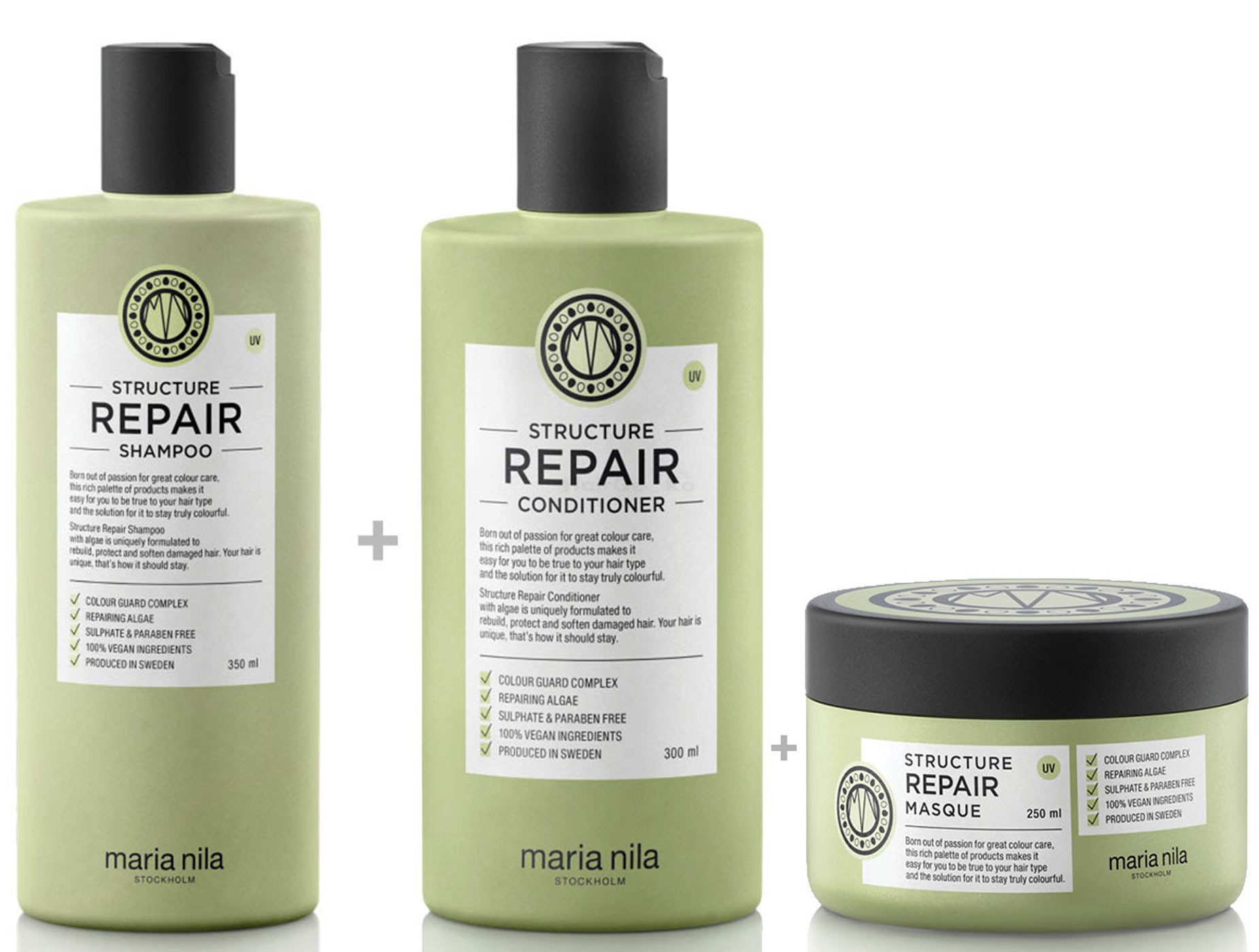 Das Maria Nila Structure Repair Shampoo ist ein sanftes Shampoo speziell für geschädigtes, trockenes und chemisch behandeltes Haar, welches Feuchtigkeit spendet und die Haarstruktur von innen stärkt. Der Farbschutz Complex schützt die Haare vor UV-Strahlen und sorgt für den Erhalt der Haarfarbe. Das Maria Nila Structure Repair Shampoo ist nicht nur 100% vegan, sondern auch paraben- und sulfatfrei.Anwendung: Ins feuchte Haar einmassieren, ausspülen und wie gewohnt mit Conditioner pflegen. Täglich anwendbar.Der Maria Nila Structure Repair Conditioner ist ein feuchtigkeitsspendender Conditioner speziell für geschädigtes, trockenes und chemisch behandeltes Haar. Reparierende Algenextrakte bauen das Haar auf und reparieren die Haarstruktur. Der Farbschutz Complex schützt die Haare vor UV-Strahlen und sorgt für den Erhalt der Haarfarbe. Der Maria Nila Structure Repair Conditioner ist nicht nur 100% vegan, sondern auch paraben- und sulfatfrei.Anwendung: Im feuchten Haar anwenden, einwirken lassen und ausspülen. Täglich anwendbar.Die Maria Nila Structure Repair Maske ist eine intensive Pflege mit reparierenden Algenextrakten. Sie schützt das Haar vor Farbverlust und repariert und stärkt die Haarstruktur. Der Farbschutz Complex schützt die Haare vor UV-Strahlen und sorgt für den Erhalt der Haarfarbe. Die Maria Nila Structure Repair Masque ist nicht nur 100% vegan, sondern auch paraben- und sulfatfrei.Anwendung: Im frisch gewaschenen, feuchten Haar anwenden, 3 Minuten einwirken lassen und ausspülen. Für einen intensiveren Effekt die Maske 5-10 Minuten einwirken lassen, ausspülen und die Anwendung mit dem Structure Repair Conditioner beenden.