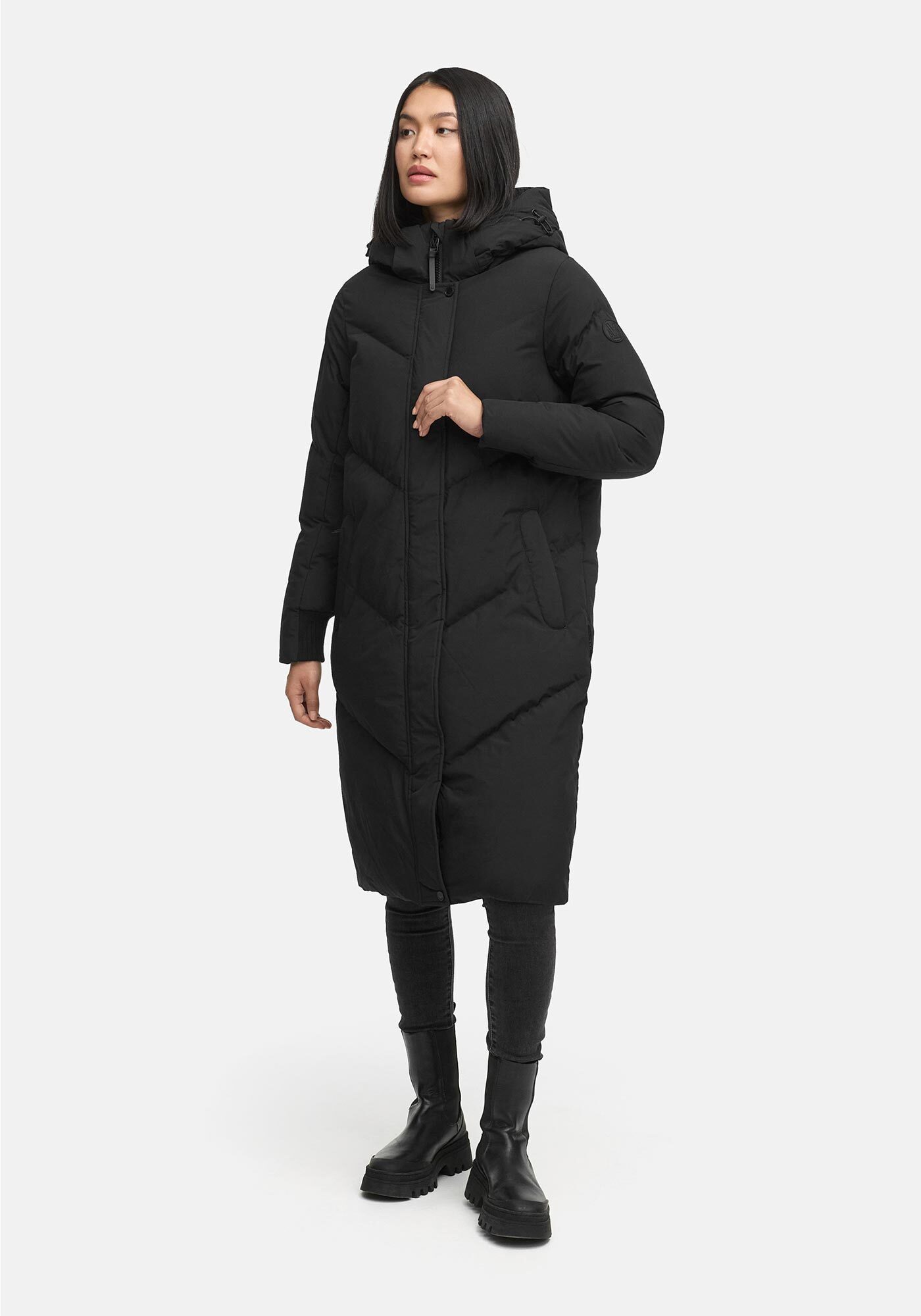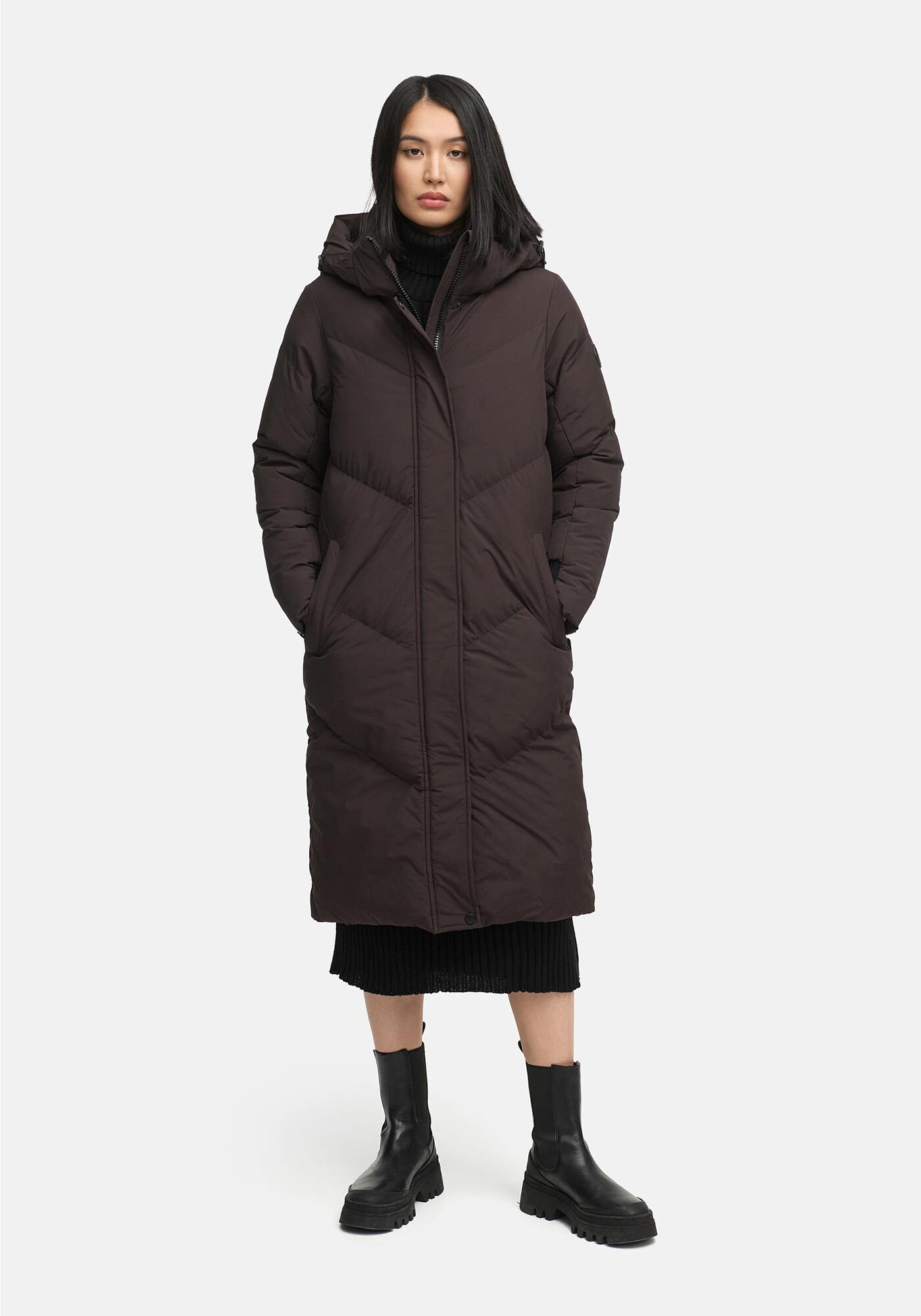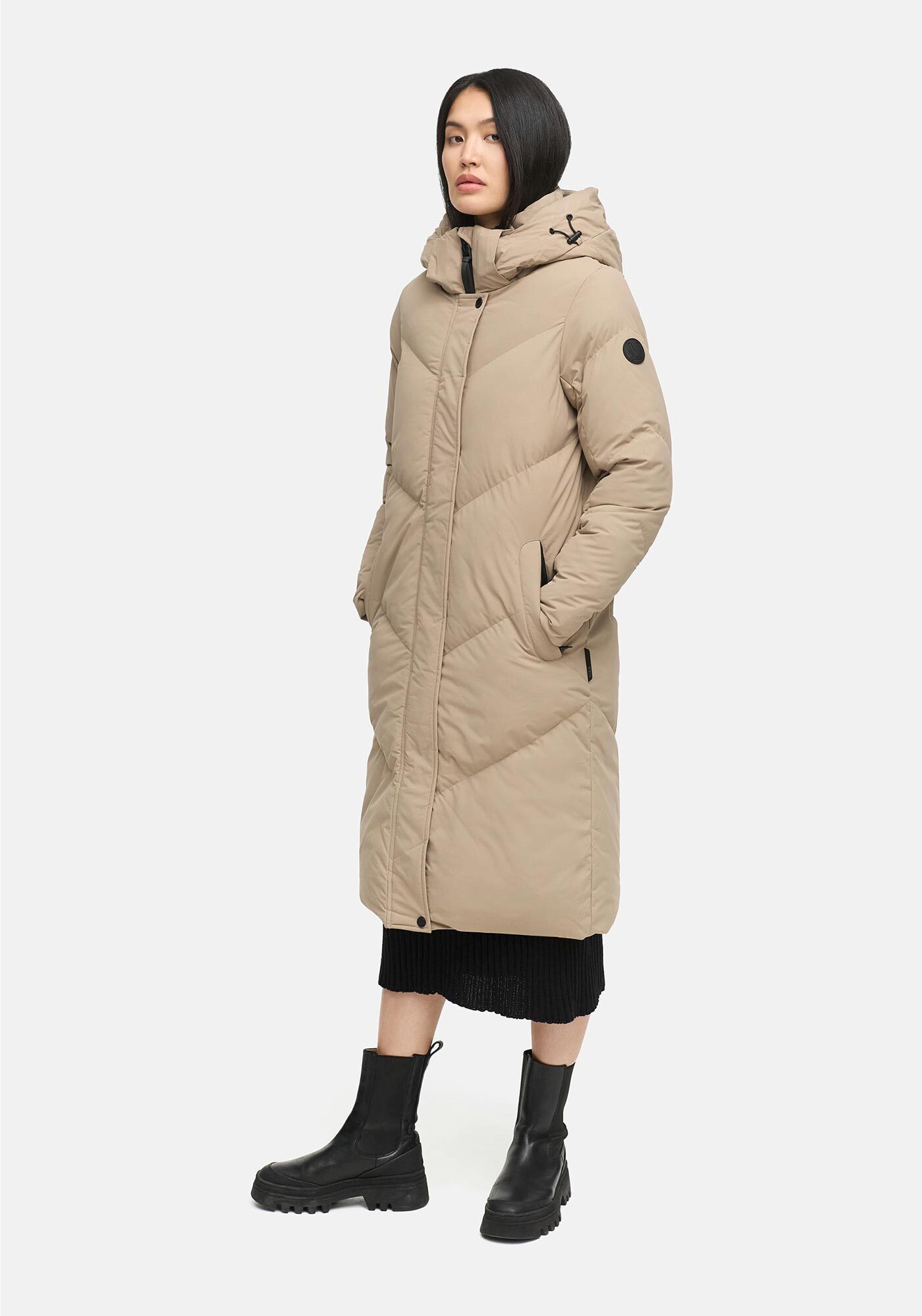Der "Teonaa" von Marikoo vereint modernen Stil mit funktionaler Wärme, perfekt für kalte Wintertage. Die schräg verlaufende Steppung und die lange, figurumspielende Passform sorgen für eine feminine Silhouette, die sportlich und elegant zugleich wirkt. Für besten Wetterschutz ist der Mantel mit einer abnehmbaren, gesteppte Kapuze mit verstellbarem Gummizug, einem hochschließenden Kragen und einer verdeckten Druckknopfleiste ausgestattet. Das winddichte Obermaterial und die leichte Isolierung halten zuverlässig warm.