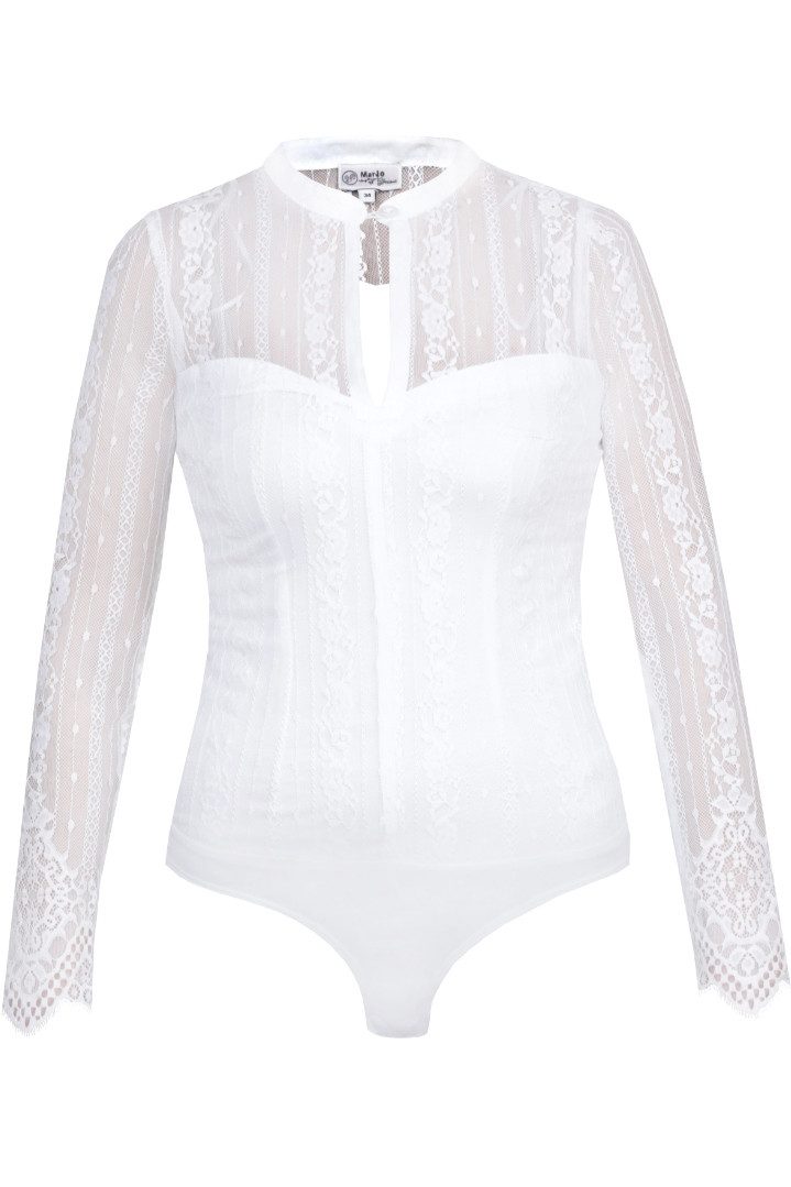 Dieser märchenhafte, hochgeschlossene Blusenbody Lavita-Madlenka in Weiß besteht aus wundervoller, floraler Ornamentik-Tüllspitze im Streifen-Design und ist feminin geschnitten. Der dezente, innen angenehm mit Baumwollstoff gefütterter Stehkragen ziert außen ein Spitzenbesatz. Vorn wird der Kragen mit einem kleinen Knopf geschlossen und darunter befindet sich ein betörender, schmaler Ausschnitt. Das blickdichte Jersey-Futter beginnt vorn mit einem sexy Herzausschnitt sowie hinten mit einem leicht abgerundeten Ausschnitt. Die Bündchen der durchsichtigen, langen Ärmel sind im Ornamentik-Stil gestaltet und enden mit edlen Fransen. Die Höschenpartie besteht aus bequemem Jersey-Material und hat einen Druckknopfverschluss im Schritt. Das Höschen sorgt zusammen mit dem Futter für einen fantastischen Tragekomfort und einen perfekten Sitz des Bodys. Kombinieren kann man diese stilvolle Bodybluse herrlich zu Trachtenjeans, Lederhose oder Trachtenrock.