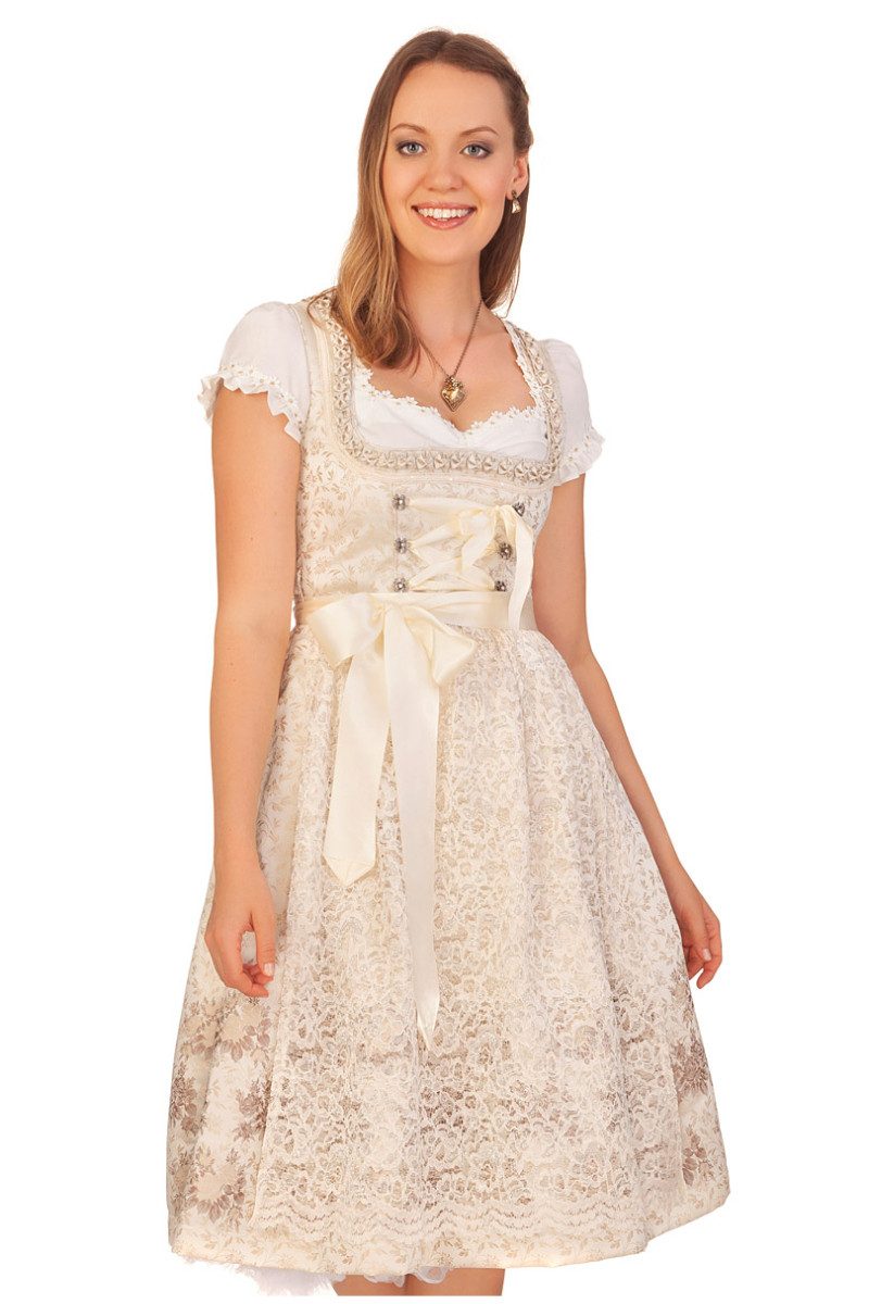 Das himmlische Dirndl mit feinstem, glänzendem Jacquard-Blüten-Muster ist ein strahlend-festlicher Blütentraum! Es ist allover mit eingewebten, zauberhaften Blütenranken verziert und die Teilungsnähte sind schön abgepaspelt. Der gerade, ebenfalls abgepaspelte Balconette-Ausschnitt ist mit einer Froschgoscherlrüsche und einer Spitzenborte, welche mit schillernden Pailletten versehen ist, betont. Die niedlichen, mit Strasssteinen besetzten Miederösen in Ornamentform halten das glänzende Satin-Schnürband. An der linken Seite des sauber abgefütterten Mieders befindet sich ein Reißverschluss, der bis zum oberen Drittel des Rockes reicht und dadurck ein einfaches Anziehen ermöglicht. Der Rock ist schön schwingend in Kellerfalten gelegt und rechts besitzt er eine Eingrifftasche. Am unteren Rockteil befinden sich farblich hervorgehobene, große, wundervolle Rosen-Motive, die ringsum eingewebt sind. Die Rocklänge ist kniebedeckend und somit ist es ein Mididirndl. Das breite Schürzenbindeband aus Satin zaubert eine tolle Taille. Die wunderschöne, transparente Spitzenschürze mit Blütenmuster und glänzenden Lurex-Fäden harmoniert perfekt mit den funkelnden Miederösen und dem schimmerden Stoff des Dirndls. Dieses eindrucksvolle Design stammt aus dem Hause MarJo. Im Lieferumfang ist das Dirndl mit Schürze enthalten; Bluse und Petticoat sind nicht inbegriffen. Beachten Sie den Übergrößenzuschlag für Размер 48.