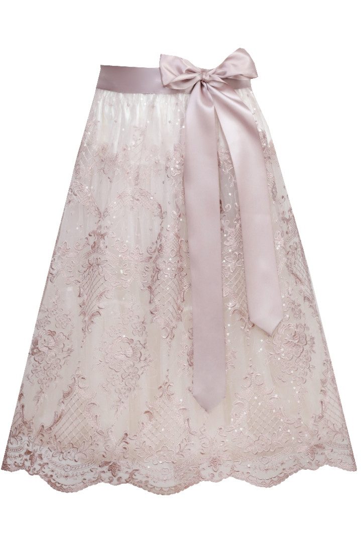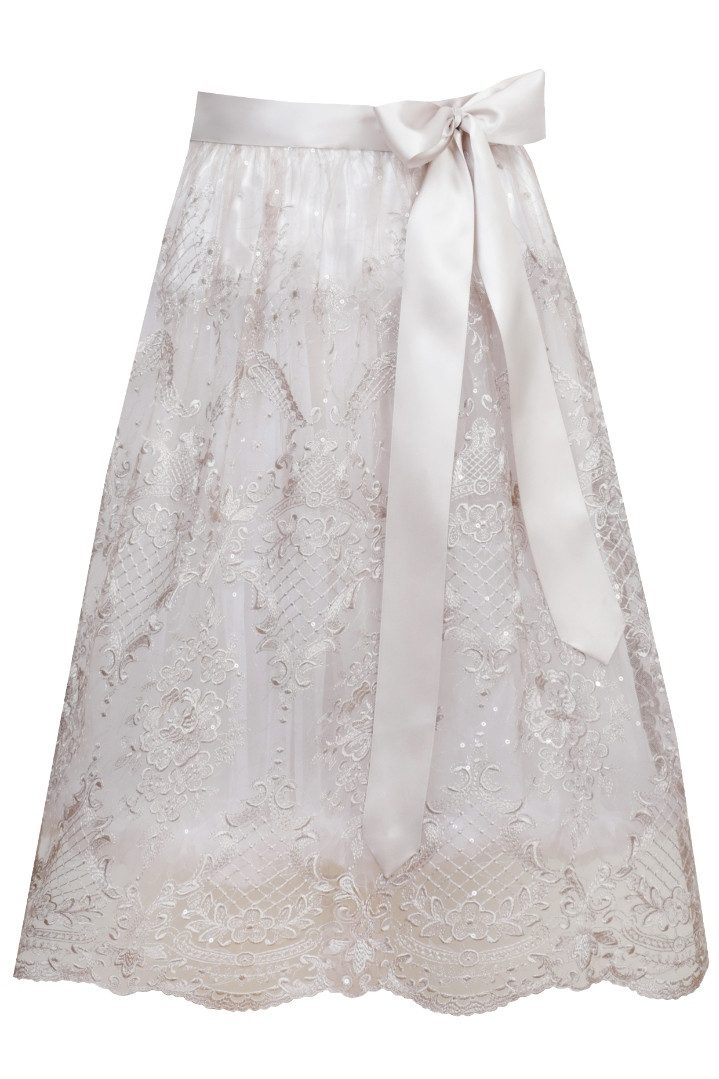 Diese traumhafte Dirndlschürze namens Benita in den Farben Altrosa sowie Helltaupe besteht aus zartem, durchsichtigem Tüll und wird von einem edel schimmernden Bindeband aus Satin gehalten. Am Bund ist sie dezent gerafft. Hinreißende, herrlich glänzende Stickereien in Form von Blumen, Blüten, Blättern, floralen Ornamenten, angedeuteten Ranken sowie feinem Gittermuster zieren die umwerfende, kniebedeckende Tüllschürze. Die Konturen sind teilweise betont, die Motive teils in zweierlei Arten gefüllt und der wellenförmige Saum ist ebenfalls schön bestickt. Komplett wird die wundervolle Dirndlschürze, die perfekt zu Dirndl mit einer Rocklänge von 65 cm passt, durch die gestreuten, glänzenden Pailletten, die die Schürze zart funkeln lassen.
