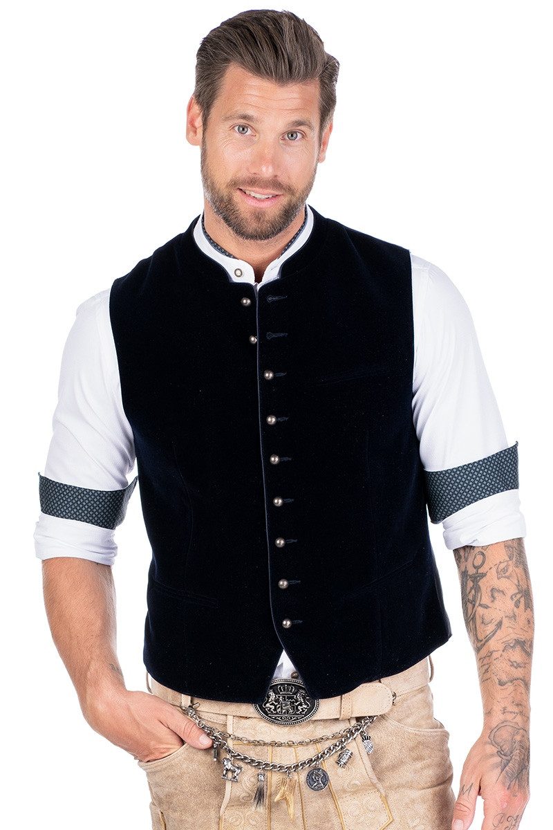 Diese festliche Herrenweste aus schimmerndem Samt überzeugt mit klassischen Trachtendetails und hochwertiger Verarbeitung. Ein verstärkter Stehkragen, fein paspelierte Knopfleiste und metallene Ösen-Kugelnöpfe in Altsilber verleihen ihr einen markanten Look. Brust- und Eingrifftaschen sind dezent doppelt paspeliert, die Rückenpartie aus Kontraststoff zeigt ein feines Blattmuster und lässt sich dank Riegel individuell anpassen. Ein leicht glänzendes Futter im Streifen-Design sorgt für angenehmen Tragekomfort. Mit praktischer Innentasche ausgestattet – perfekt zur Lederhose oder als stilvolle Ergänzung zum Trachtenoutfit. Bitte Größenzuschlag ab Размер 58 beachten.