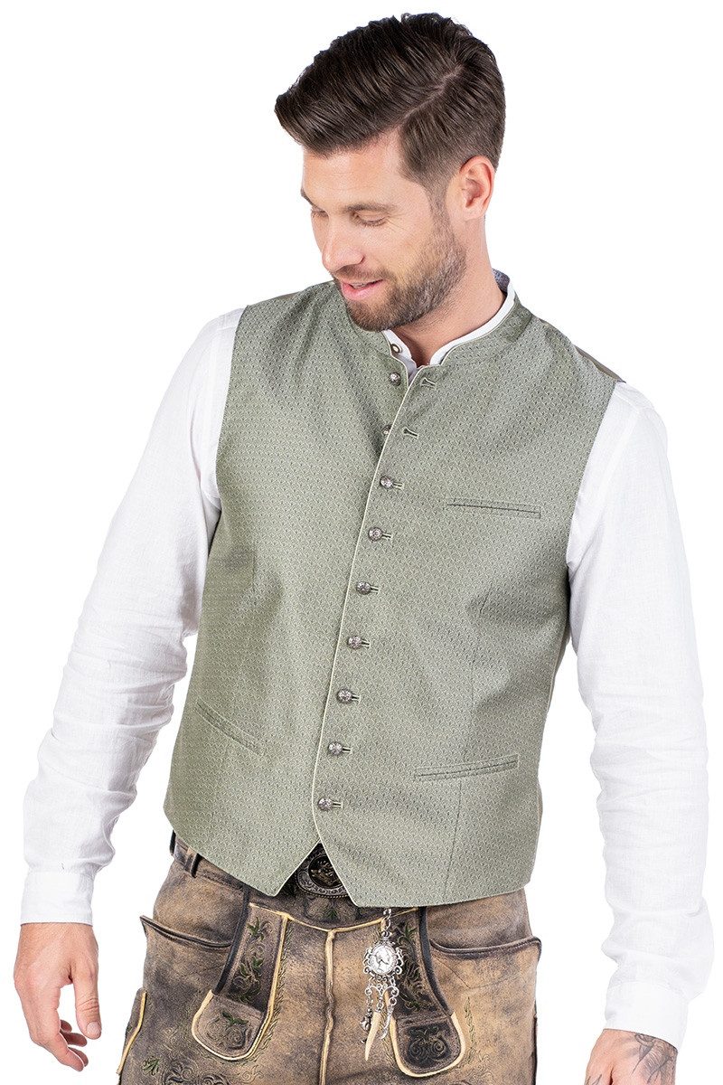 Diese elegante Herren-Trachtenweste verleiht jedem Trachtenlook eine stilvolle Note. Die Vorderseite überzeugt mit einem glänzenden Webmuster, verziert mit Rautenmuster und Ornamenten in Blattform. Der klassische, verstärkte Stehkragen und die Knopf- sowie Knopflochleiste mit Paspelkante aus Rückenstoff unterstreichen das traditionelle Design. Altsilberne Ösenknöpfe im Ornamentik-Stil setzen edle Akzente. Praktische Taschen – eine Brusttasche und zwei Eingriffstaschen, beide mit doppelter Paspel aus Westenstoff – bieten Platz für kleine Essentials. Die changierende Rückseite mit verstellbarem Stoffriegel und ein schwarzes Taftfutter sorgen für einen perfekten Sitz. Eine zusätzliche Innentasche rundet das Design ab. Ideal kombinierbar mit der Lederhose für einen klassischen Auftritt. Größenzuschläge ab Размер 58 beachten.