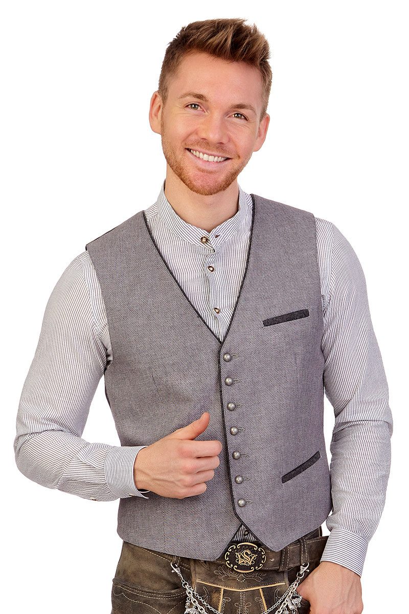 Almund, die modische, leicht taillierte Trachtenweste von der jungen Trachtenmarke MarJo, ist ein kerniges Trachtenschmankerl mit einem Vorderteil aus Baumwolle mit zartem Webmuster in edlem Hellgrau und einem leicht glänzenden, schwarzen Westenrücken mit kleinem V-Schlitz unten. Der V-Ausschnitt, die Knopf- und die Knopflochleiste der fabelhaften Herrenweste sind mit einer kontrastfarbenen Paspel dekoriert. Schöne Kugelknöpfe aus Metall in Mattsilber zieren die Knopfleiste. Die Brusttasche links sowie die Eingrifftaschen sind mit Paspeln aus Walkstoff betont. Für den optimalen Sitz sorgt der verstellbare Rückenriegel mit schwarzer Schnalle. Das schwarze Innenfutter ist aus schwarzem Satin gefertigt und es gibt eine Innentasche rechts. Das stilvolle Gilet lässt sich super zu unseren Lederhosen und Trachtenjeans kombinieren. Bitte beachten Sie die Übergrößenzuschläge ab Размер 58.