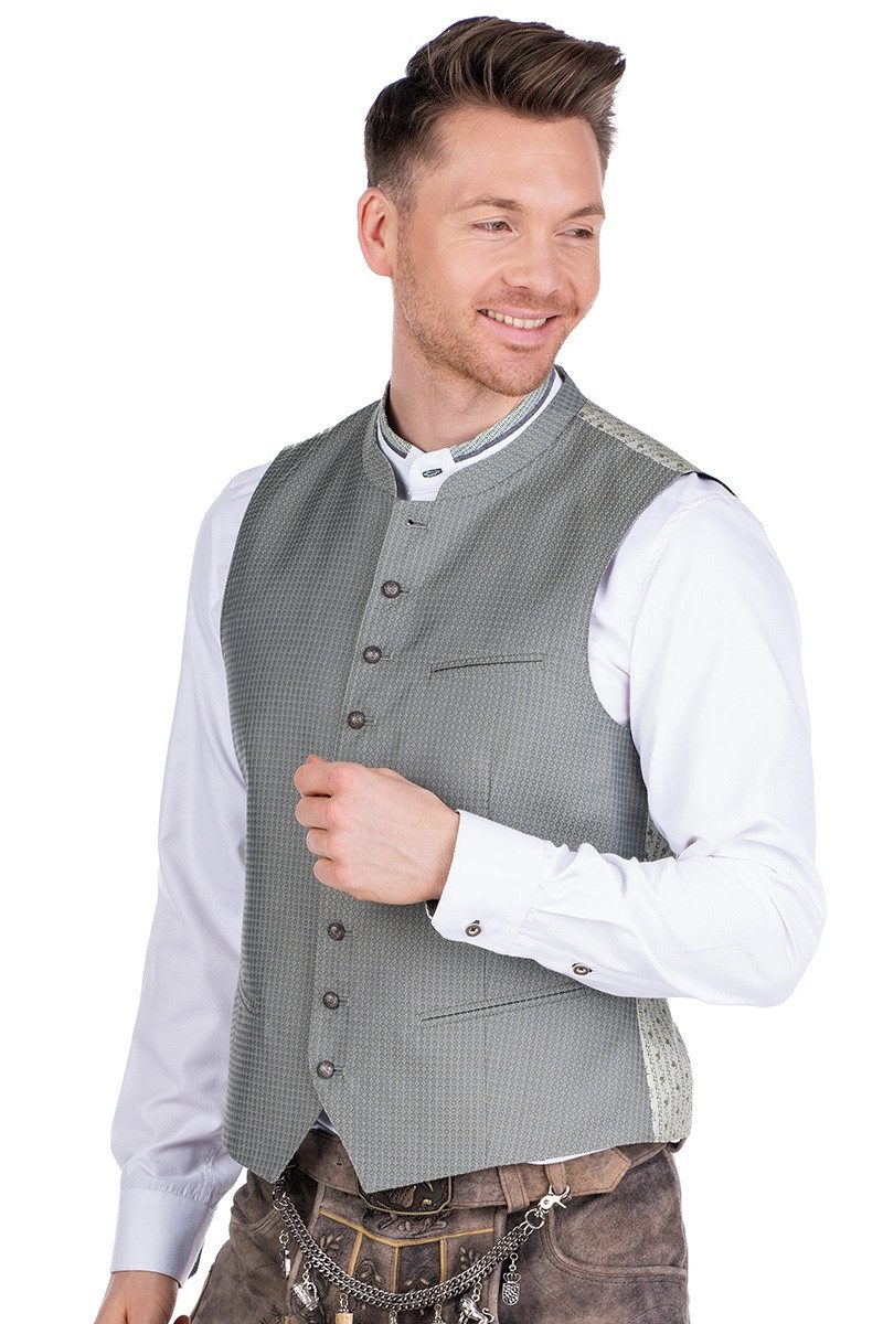 Diese stilvolle, leicht tailliert geschnittene Trachtenweste "Anton" für Herren besticht durch ihre Vorderseite im fein changierenden Jacquard-Stil in Gischtgrün mit dem floral anmutenden Webmuster aus einem dezenten Gittermuster mit vierblättrigen Blüten als Schnittstellen und Kringeln, das je nach Lichteinfall ein dezenten Blaustich erkennen lässt. Der Stehkragen ist innen mit Rückenstoff verstärkt. Links gibt es eine Brusttasche und beidseitig vorn Eingrifftaschen, jeweils betont mit einer doppelten Paspel aus Westenstoff. Das Gilet wird mit schönen Ösen-Kugelknöpfen aus Metall in Altsilber mit floralem Ornamentik-Motiv geschlossen. Der Rücken präsentiert sich geschmackvoll glänzend in Jacquard-Art mit einem Linien-Webmuster aus zarten, geschwungenen Blumenranken und geraden Blätterranken in dunklem Grün auf grünlichem Beige. Für einen perfekten Sitz ist rückseitig ein Riegel aus Rückenstoff mit einer Schnalle in Mattsilber angebracht. Das Innenfutter im Taft-Stil mit dem zarten Linien-Webmuster in Schwarz sorgt für einen angenehmen Tragekomfort und verfügt über eine Innentasche links. Diese Herrenweste ist eine ideale Ergänzung zur Lederhose. Bei Размер 58 und größer ist ein Größenzuschlag zu beachten.
