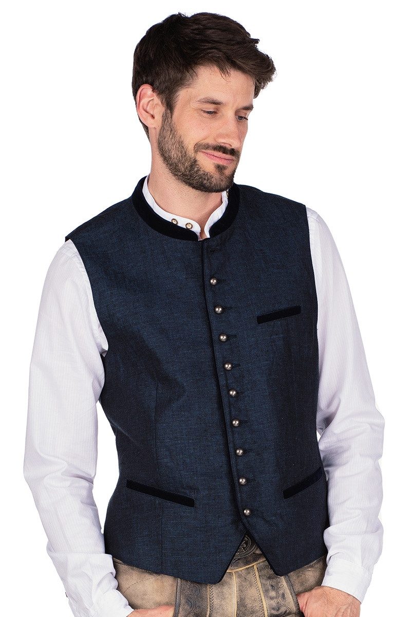 Die kernige, leicht taillierte Trachtenweste Jonathan für Herren besteht aus rustikalem Leinen und hat ein feines, zweifarbiges Webmuster in Leinwandbindung-Art mit leicht unregelmäßiger Struktur in Blau/Schwarz bei der marine-farbenen Варианты bzw. Schwarz/Hellbeige in Melange-Optik bei der kohlegrauen Варианты. Der verstärkte Stehkragen, die einfachen Paspeln der Brusttasche links und die der Eingrifftaschen sind aus Samt in Deep Ocean Blue bzw. dunklem Tannengrün gearbeitet. Auch die mit schlichten Kugelknöpfen in Mattsilber besetzte Knopf- sowie Knopflochleiste ziert jeweils eine feine Paspel. Auf dem Rücken gibt es einen verstellbaren Rückenriegel aus Westenstoff mit einer Schnalle in Anthrazit für den perfekten Sitz und das schwarze Futter aus Satin sorgt für einen guten Tragekomfort. Zudem gibt es links eine Innentasche mit Paspel, Knopf und Schlaufe. Bitte beachten Sie den Größenzuschlag bei Размер 58.