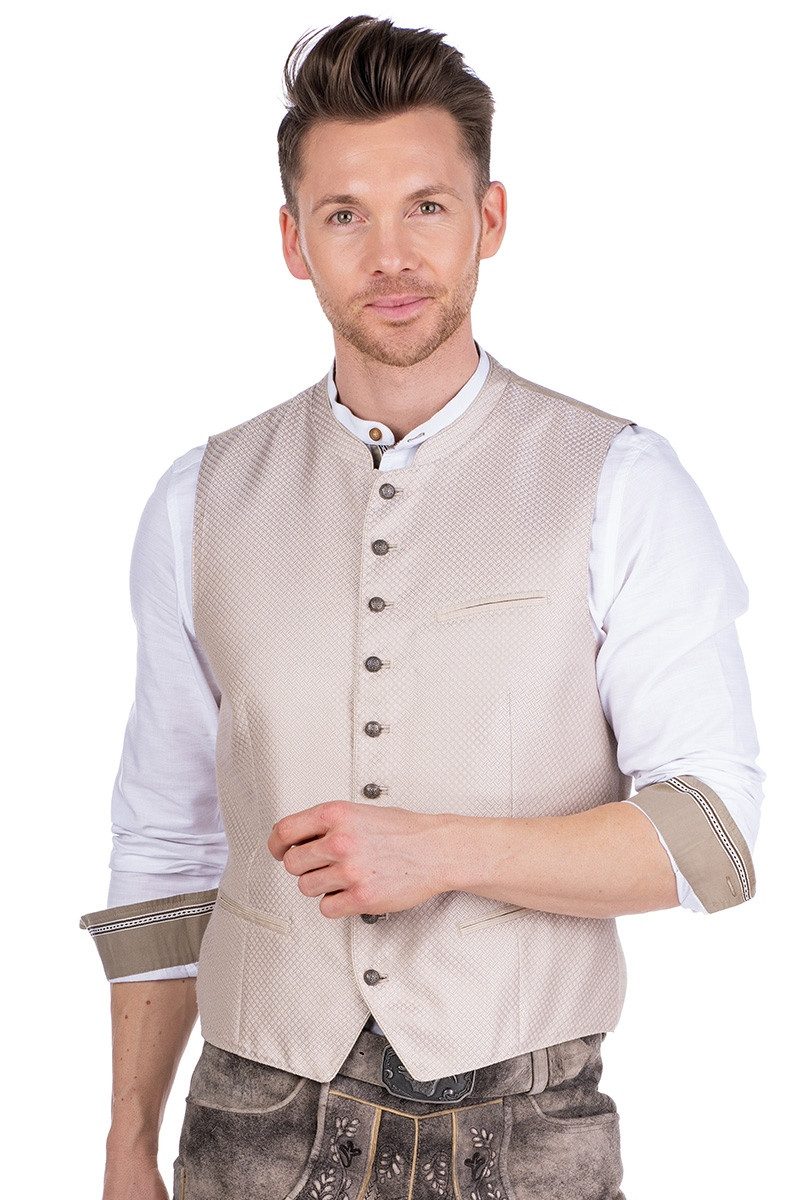 Die festliche, leicht tailliert geschnittene Trachtenweste "Paul" für Herren präsentiert sich vorderseitig in edel schimmernder Jacquard-Art mit einem raffinierten Webmuster im diagonalen Gitter-Look. Der Stehkragen ist verstärkt und - ebenso wie die Knopf- und Knopflochleiste - mit einer Paspel aus Rückenstoff veredelt. Links befindet sich eine Brusttasche und beidseitig vorn Eingrifftaschen, die jeweils mit einer doppelten Paspel aus Westenstoff verziert sind. Die Herrenweste wird mit schönen, altsilbernen Ösenknöpfen aus Metall im Antik-Look geschlossen, die ein florales Ornamentik-Motiv tragen. Der Rücken mit dem feinen Linien-Webmuster in Beige, wobei die schmaleren Linien je nach Lichteinfall heller oder dunkler wirken, macht die Kreation perfekt. Für einen perfekten Sitz ist rückseitig ein Riegel aus Rückenstoff mit einer Schnalle in Mattsilber angebracht. Das Innenfutter im Satin-Stil in Beige sorgt für einen angenehmen Tragekomfort und links gibt es eine Innentasche. Das Gilet für Herren ist eine ideale Ergänzung zur Lederhose. Bitte beachten Sie die Größenzuschläge ab Размер 58.