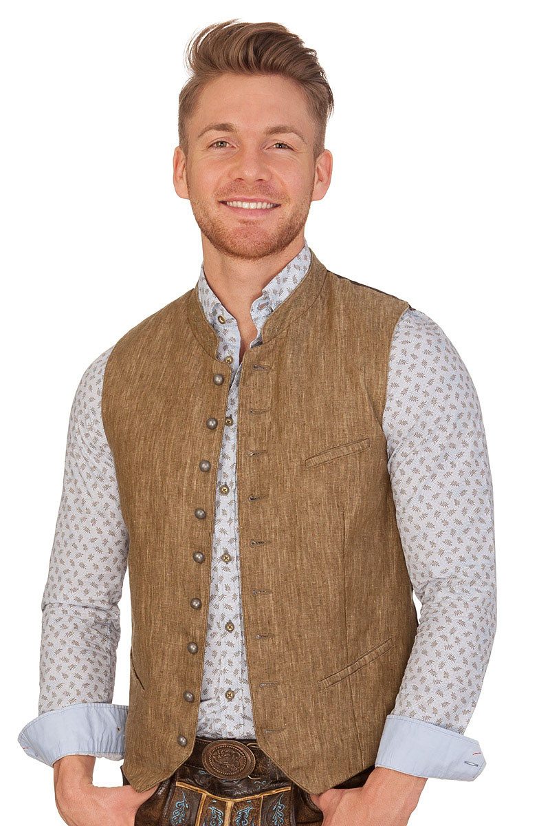 Die grandiose Herrenweste Roman aus feinem Leinen, mit traditionellen Kugelknöpfen und schickem, bestickten Stehkragen überzeugt in stilvoller Eleganz im urigen Trachtenlook. Der reine Leinenstoff vorn besitzt eine raffnierte, besondere Optik und der schöne Westenrücken ein edles, klassisches Schwarz. Zudem sorgt der Rückenriegel für einen perfekten Sitz. Innen ist die Weste sauber abgefüttert mit einem herrlich zünftigen Karostoff. Auf der Vorderseite befindet sich auf der linken Brustseite eine fesche Paspeltasche sowie jeweils eine schicke Eingrifftasche weiter unten auf beiden Seiten. Die Trachtenweste ist mit traditionellen Kugelknöpfen ausgestattet und kleidet Sie perfekt zur Trachtenjeans und Lederhose. Sie stammt aus dem namenhaften Trachtenhaus Marjo.