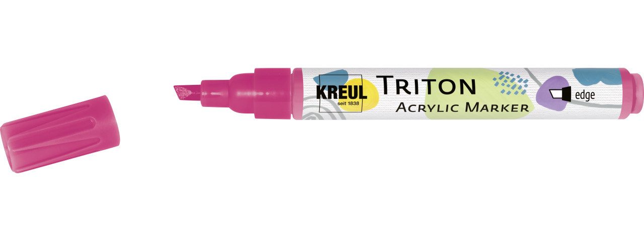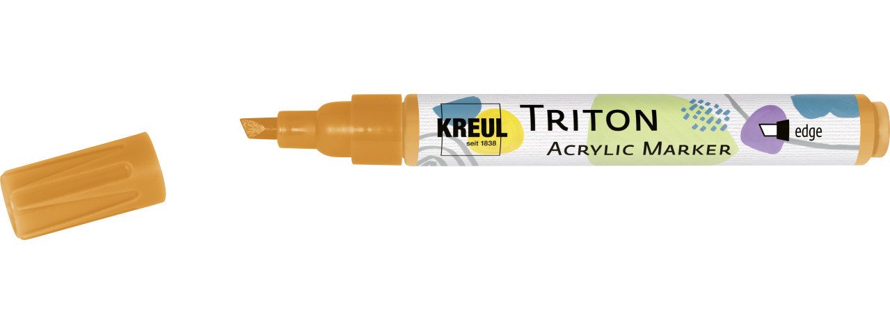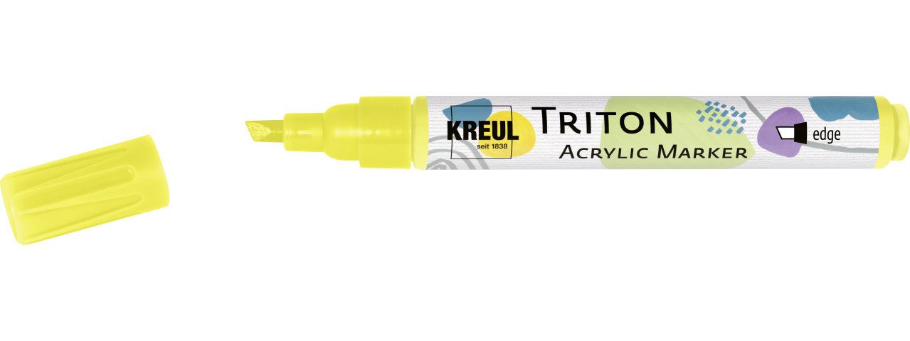 Farbbrilliante KREUL Triton Acrylic Marker 'edge' für farbenprächtige Zeichnungen und Gemälde. Die Keilförmige Spitze sorgt für Strichbreiten von 1-4 mm. Ideal für unterwegs.