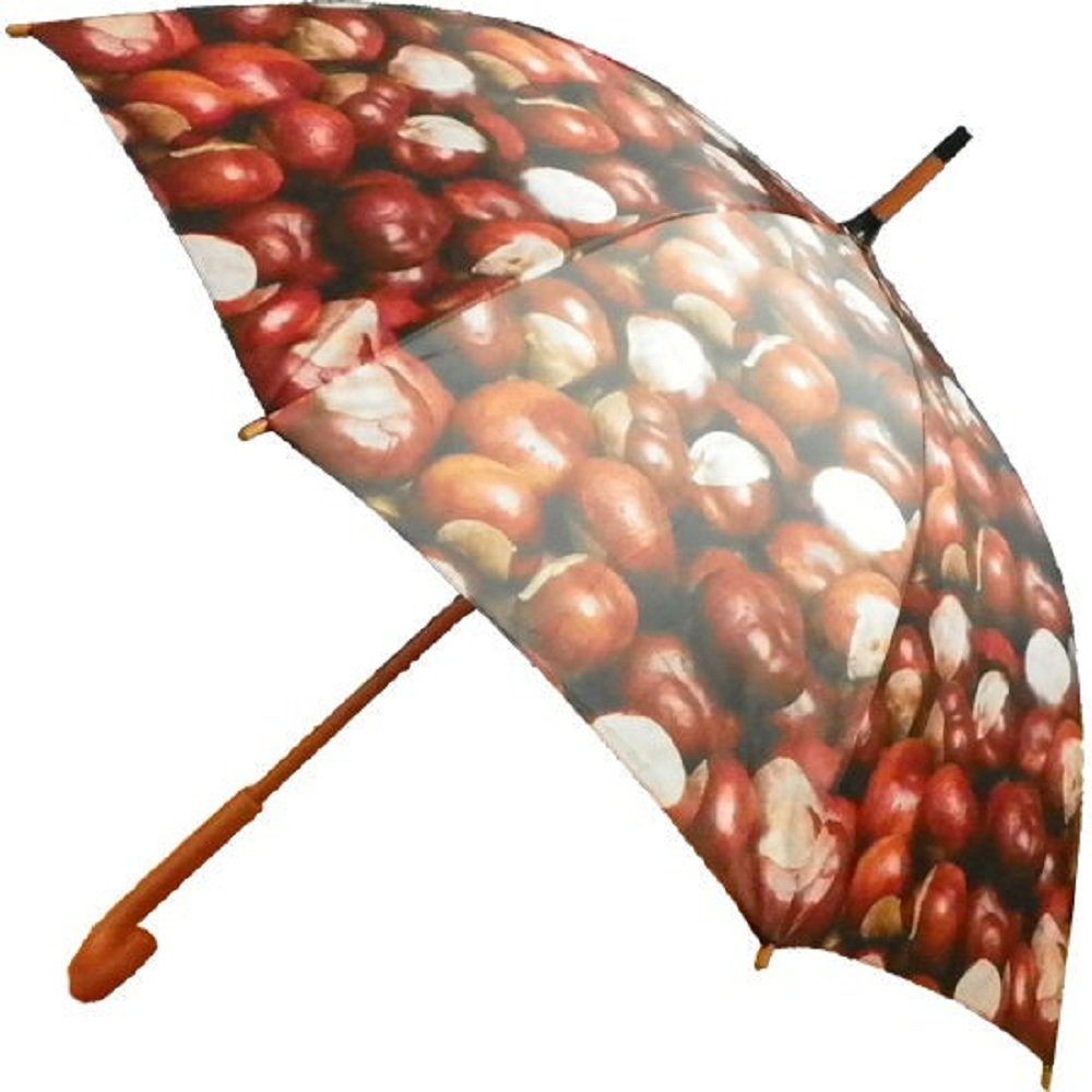Hübscher Regenschirm Kastanien - Motiv gegen die Tristesse bei Schmuddelwetter. Unter diesen großen Stockschirm passt man auch mal zu zweit.