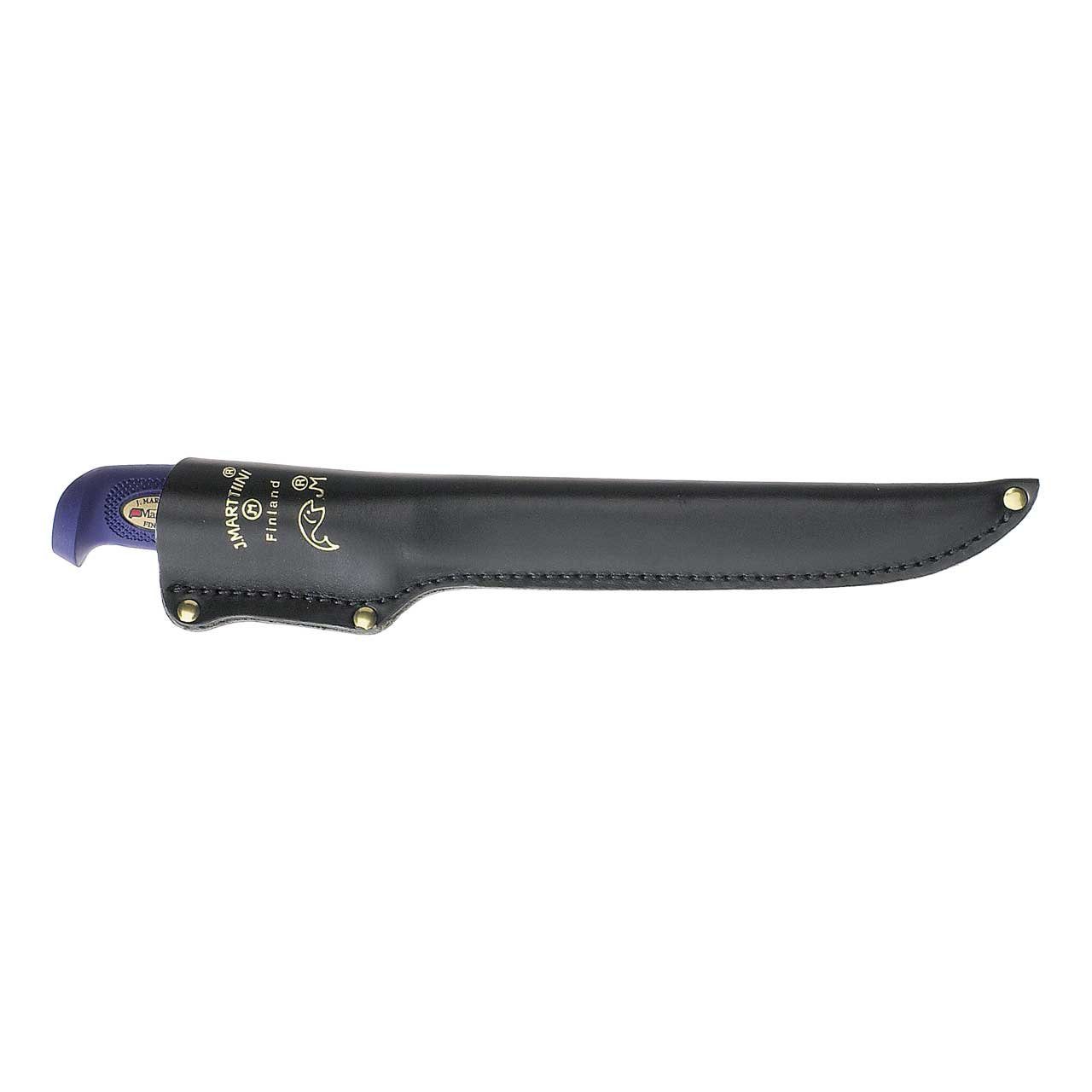 Bei diesem Marttiini Hi-Tech-Filetiermesser ist die elastische Klinge mit einer Martef-Klingenbeschichtung versehen. Da bleibt nichts kleben und der Schnitt ist besonders sauber. Der Kautschuk-Griff lässt sich auch mit nassen Händen fest und sicher greifen. Zum Transport steht eine echte Lederscheide mit Durchstechschutz zur Verfügung.