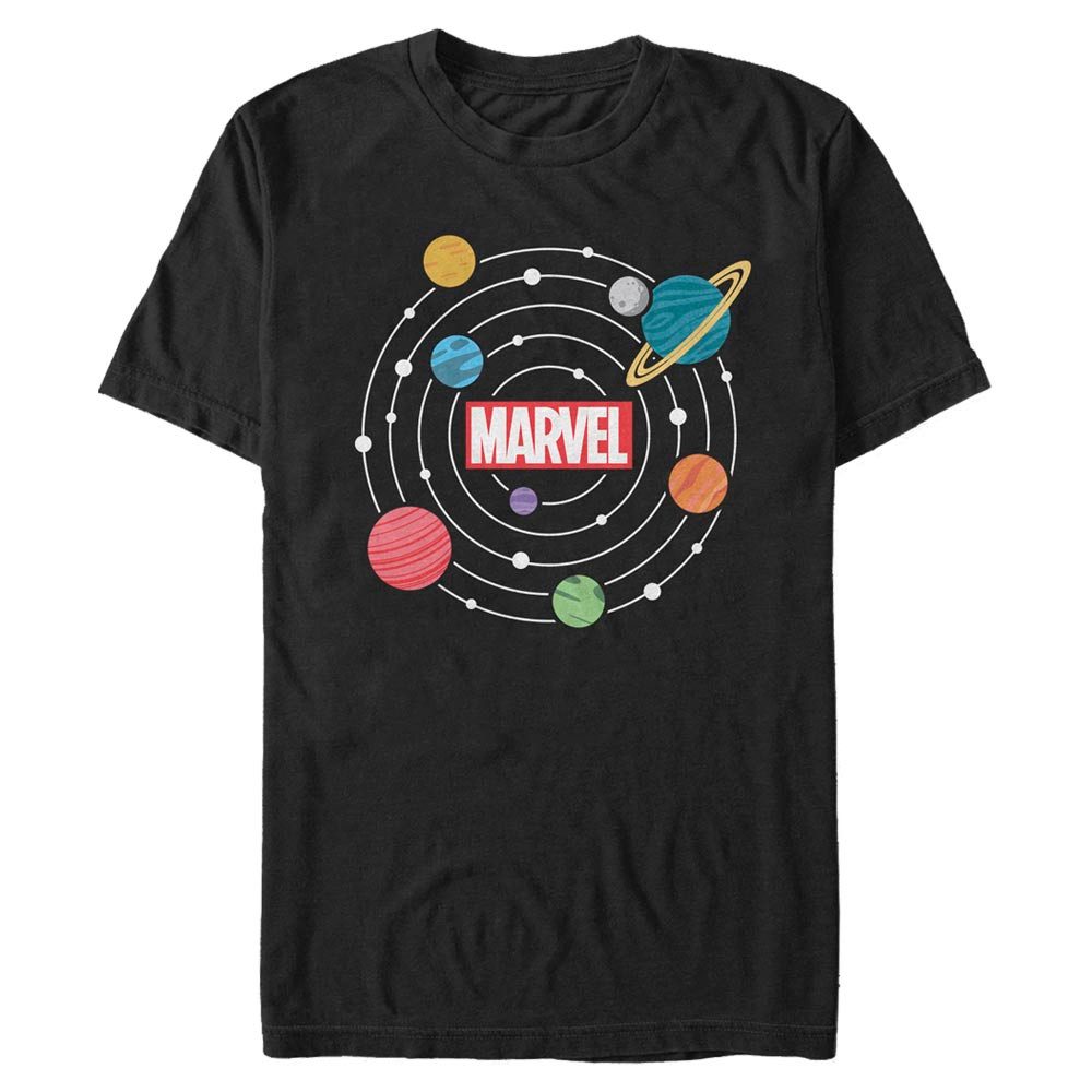 Das T-Shirt zeigt das Marvel Logo umgeben vom Sonnensystem.
