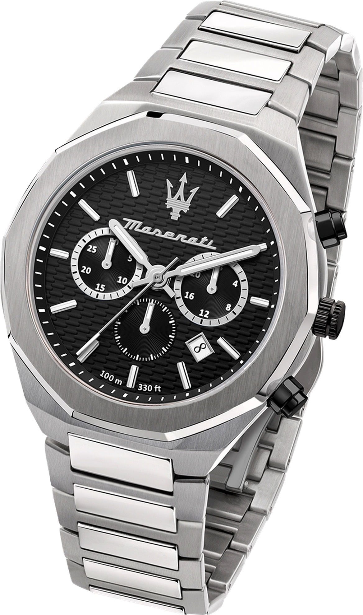 Die Elegant Uhr der Marke Maserati hat ein schönes Armband aus Edelstahl in silber mit Faltschließe. Eine Uhr aus der Maserati STILE Kollektion für Herren in der Gehäusefarbe silber mit Armbanduhr. Die Chronographuhr mit Mineralglas hat ein Zifferblatt in der Farbe schwarz. Die Form der Uhr ist rund und das Gehäuse ist groß ca. 45mm.