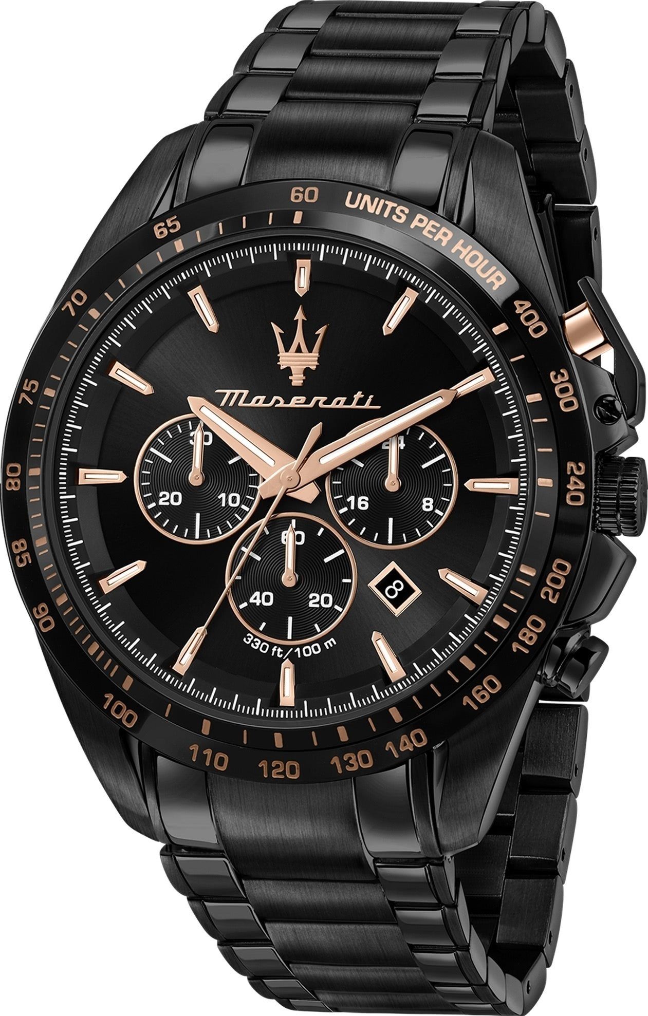Die Fashion Uhr der Marke Maserati hat ein schönes Armband aus Edelstahl in schwarz mit Faltschließe. Eine Uhr aus der Maserati TRAGUARDO Kollektion für Herren in der Gehäusefarbe schwarz mit Armbanduhr. Die Chronographuhr mit Mineralglas hat ein Zifferblatt in der Farbe schwarz. Die Form der Uhr ist rund und das Gehäuse ist groß ca. 45mm.