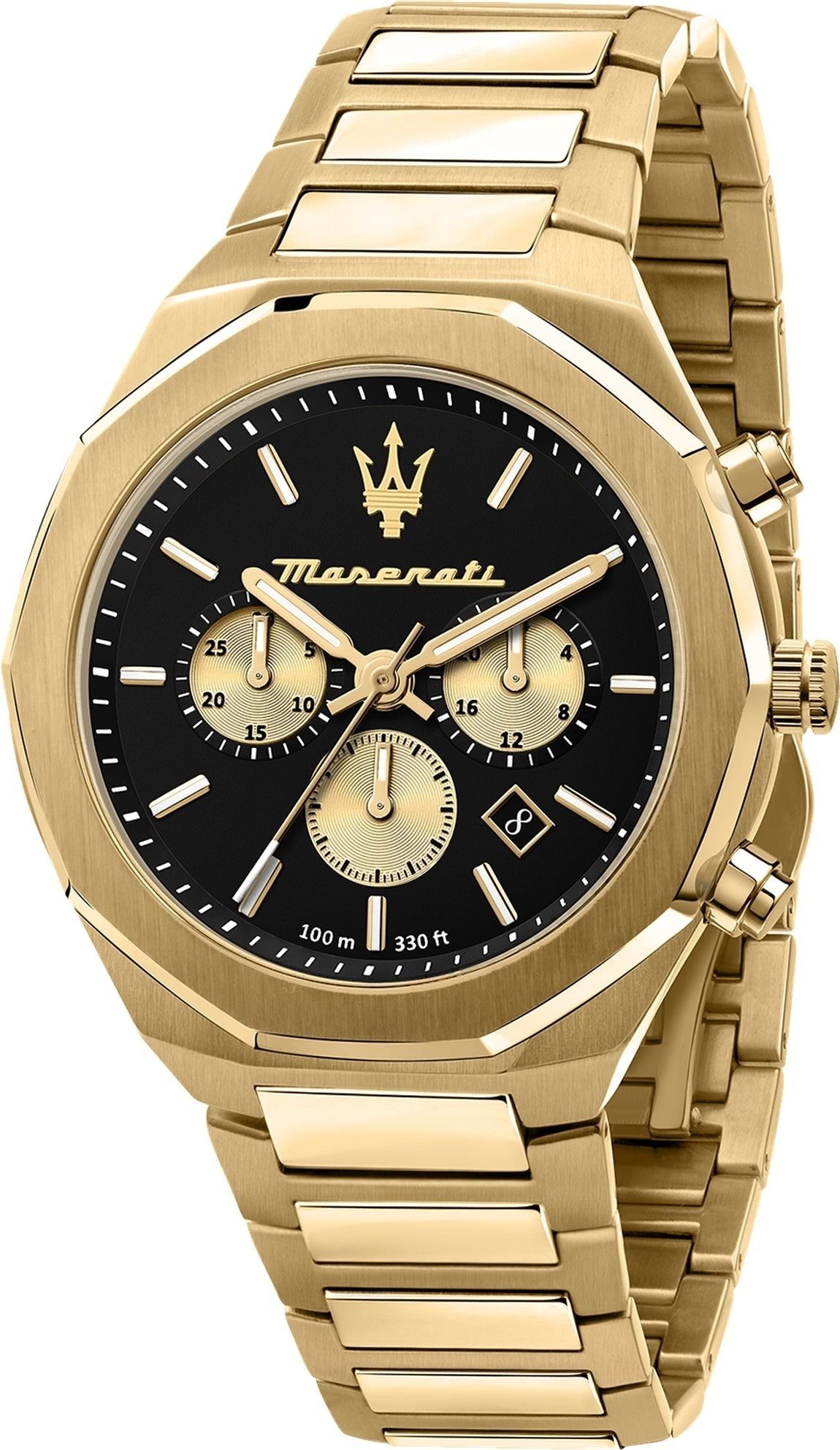 Die Luxus Uhr der Marke Maserati hat ein schönes Armband aus Edelstahl in gold mit Faltschließe. Eine Uhr aus der Maserati STILE Kollektion für Herren in der Gehäusefarbe gold mit Armbanduhr. Die Chronographuhr mit Mineralglas hat ein Zifferblatt in der Farbe blau. Die Form der Uhr ist rund und das Gehäuse ist groß ca. 45mm.